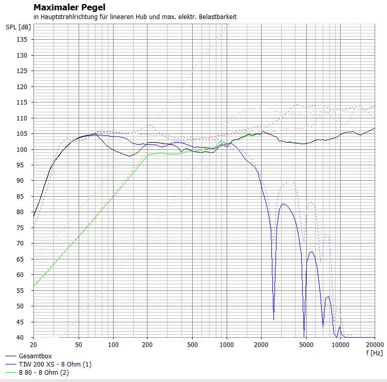 Die Trennfrequenz TT-MT finde ich o.k.. Das rechnerisch Hubmaximum wird erst bei schwindligen Leistungen erreicht. Die Box kann viel mehr Pegel als z.B. eine Solo 15.