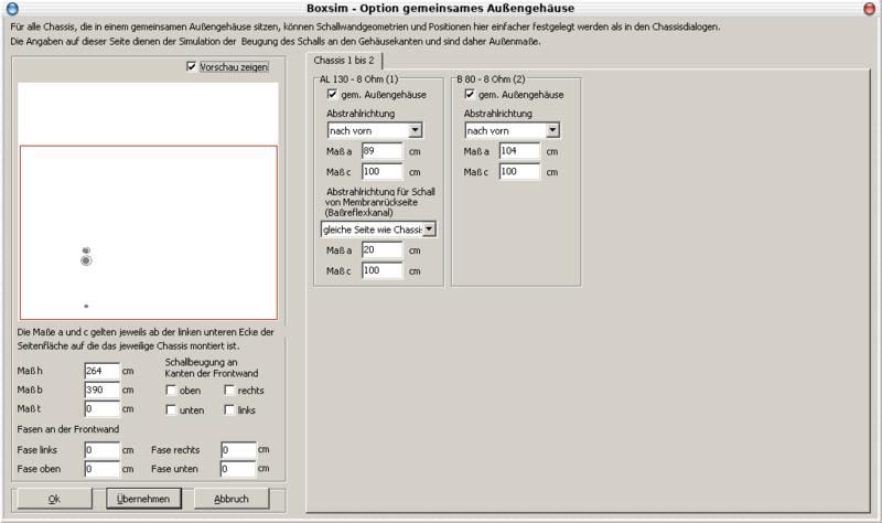 Die Fasen sind Null, und natürlich kannst Du die Wandabmessungen als Boxenfront eingeben, mit den korekten Massen für die lage der Chassis....