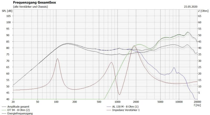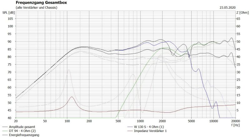 Ich habe die Simu nur auf die schnelle gemacht. Du kannt das Gehäuse ja mal auf 17x17 ändern und den DT94 unter "Schallwand und Position" dann unter "vertikal" mal die 9,2cm nach oben versetzten. Wie gesagt, die Einzelfrequenzgänge würde ich nur beachten um die Trennfrequenz fest zu legen und ggf. die Phase anzupassen (k.A. ob die korrekt simuliert wird). Der EGF ist dann ja die gesamte angestrahlte Energie, die auch halbwegs dem FG entsprechen könnte, den man dann hört, wenn man sich um die Lautsprecher bewegt, siehe FZZ.