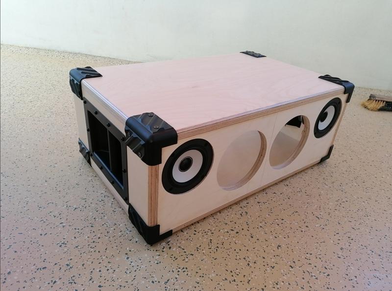 mir geht es bei der Neuauslegung um zwei Dinge: Leichter und Kostengünstiger, gerade bei der Größe (Höhe) und bei der Elektronik, ich möchte gleich alles in die Boombox einbauen, Akku und Verstärker sollte gleich komplett ins Innere.