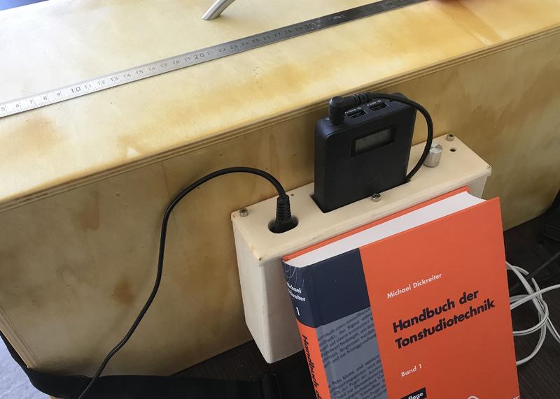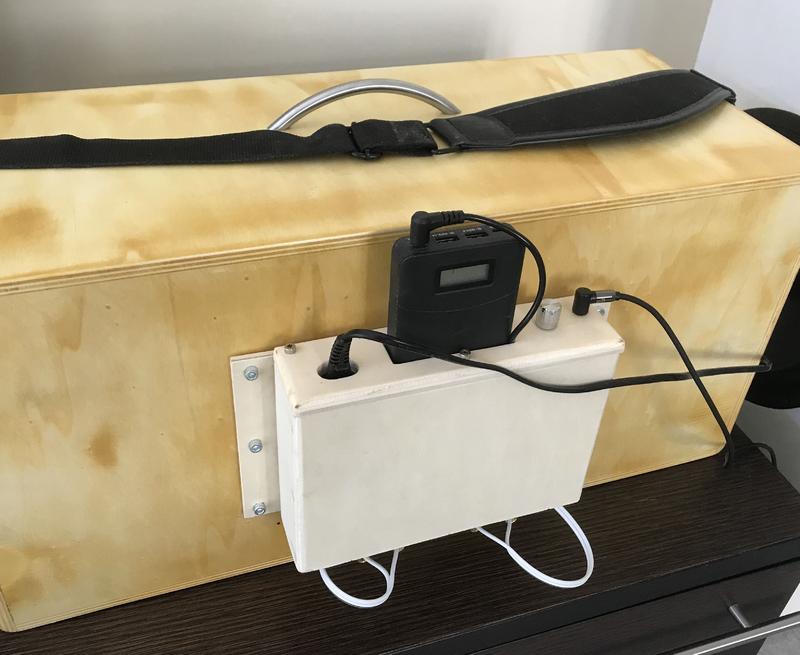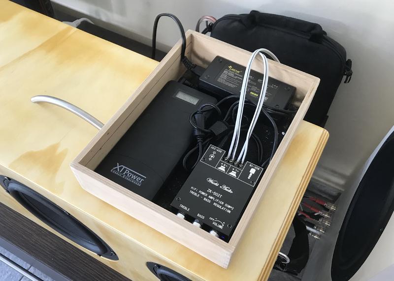 der Kleinverstärker von fosi-audio, die Powerbank und der Trafo wurde in ein passendes Gehäuse eingebaut. Aktuell ist es so konzipiert dass das kleine Gehäuse von hinten vorübergehend befestigt wird. Der Verstärker kann per Bluetooth und Klinke mit Musik versorgt werden.