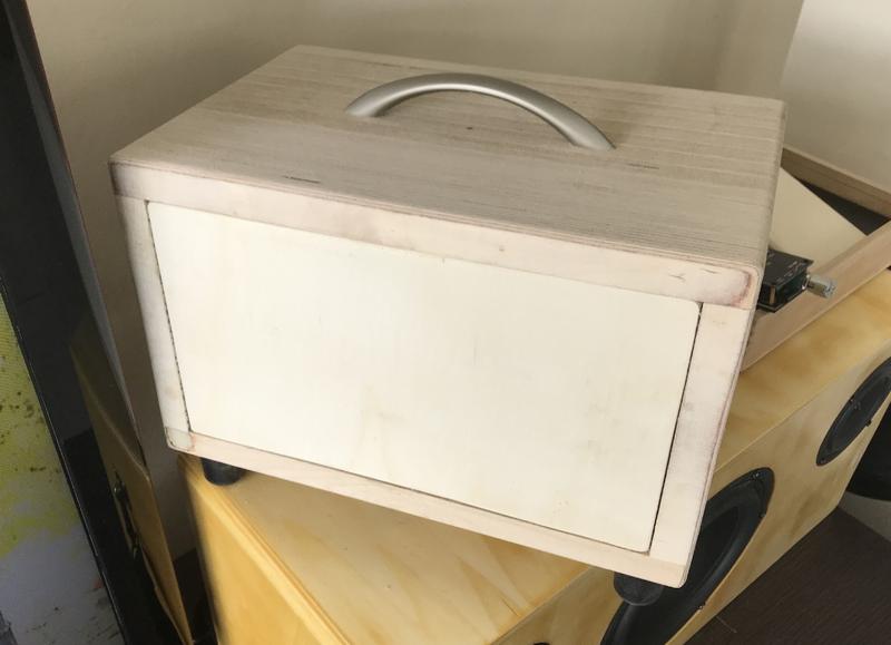Die Box ist so gemacht, dass die Rückwand entnehmbar ist, dazu musste ein Rahmen gesägt und eingeleimt werden, auch das Trennbrett musste in dem Zuge noch eingeleimt werden. Ein Griff und vier Gummifüße wurden gleich mit angebracht.