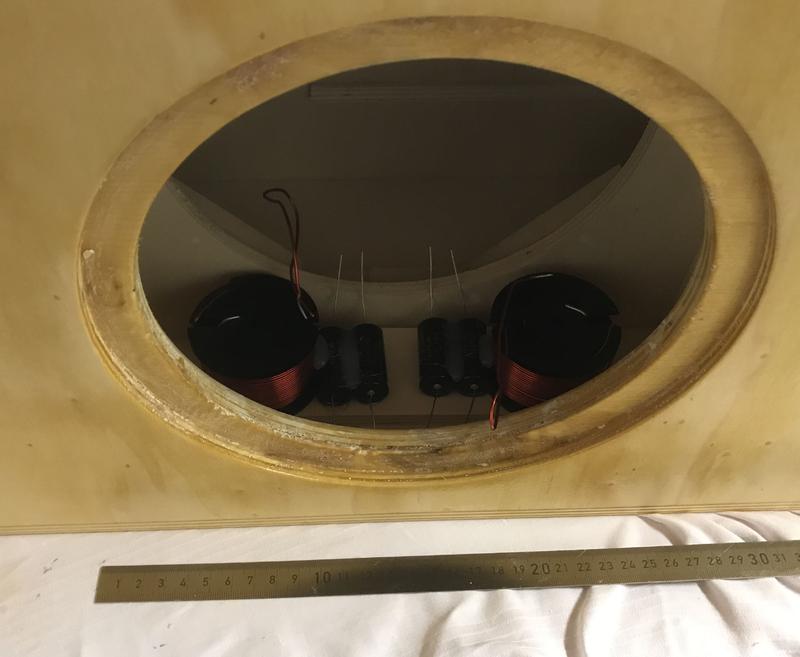 nachdem heute "früh" morgens mit dem letzten Zwischenschleifen und Aufbringen der letzten Schicht beendet wurde, geht es nun an die Weiche, und da hatten ich ja gestern nochmals in mich gehört welche Variante ich zunächst aufbauen möchte, ... es ist die schwere Variante aus 1.5 mH Spule 1.4 mm starker Draht und somit gemessenen 0,34 Ohm Widerstand, dazu anstatt 220 µF Elko zwei 100er, welche allerdings im Doppelpack selektiert auf um die 210 µF kommen. (ich lasse mir noch etwas Platz auf dem Weichen-Brettchen für eventuelle Hochpässe und eventueller Hochtonkorrektur bei 7 kHz, ...)