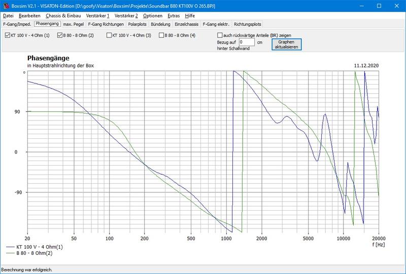 Im ersten Schritt habe ich eine einfach aufgebaute Holzkiste definiert, die noch verträglich in die Lücke passt, danach mit den Chassis bestückt, Volumen verteilt. Herausgekommen ist die angehängte Box. Boxsim-Dateien habe ich mit angehängt, jeweils volle Abmessungen, einmal zur Hälfte, einmal mit beiden Kanälen angeschlossen. Kantenbeugung nach oben habe ich in beiden Fällen deaktiviert, da die Bar nahezu nahtlos in die Front des TV übergeht (richtig so?).