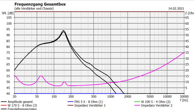 Mit 2x W170S-8 parallel ohne Tiefpass für den Bassteil und ohne Hochpass für die WHy, nur mit +3dB für den Bandpass, also quasi Biamping. HT-Part einfach mal weggelassen. Insgesamt sicher kein Pegel-Monster, muss aber auch nicht.