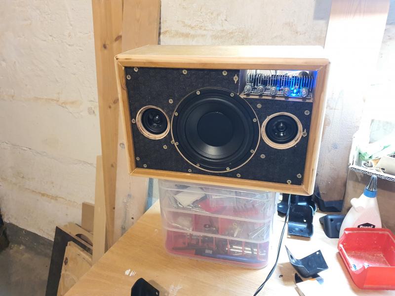 Sieht erst einmal richtig gut aus finde ich. Fast zu schade, um es mit Bespannstoff zu verdecken. Aber ohne Schutz wäre es wohl auch nicht so gut. Nur der Verstärker in der Ecke wäre nicht so mein Ding. Ich glaube, ich würde in notfalls extern benutzen, als kleiner Zusatzkasten obendrauf. Anderseits, wenn das ganze hinter Bespannstoff verschwindet, außer die Regler, geht es auch wieder.