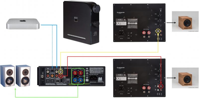 Von meinem Mac mini möchte ich gern das Audio Signal zu meinem NAD 3045 schicken. Von dort aus sollen zwei Arias an den Lautsprecherklemmen spielen und ich möchte meine beiden Subwoofer mit W130X jeweils links und rechts als Unterstützung einbringen. Diese sollen über jeweils ein SAM300D (wurden eigentlich für ein anders Projekt beschafft, sollte aber erst mal gehen solange man nicht zu kräftig am Regler dreht) angesteuert werden.