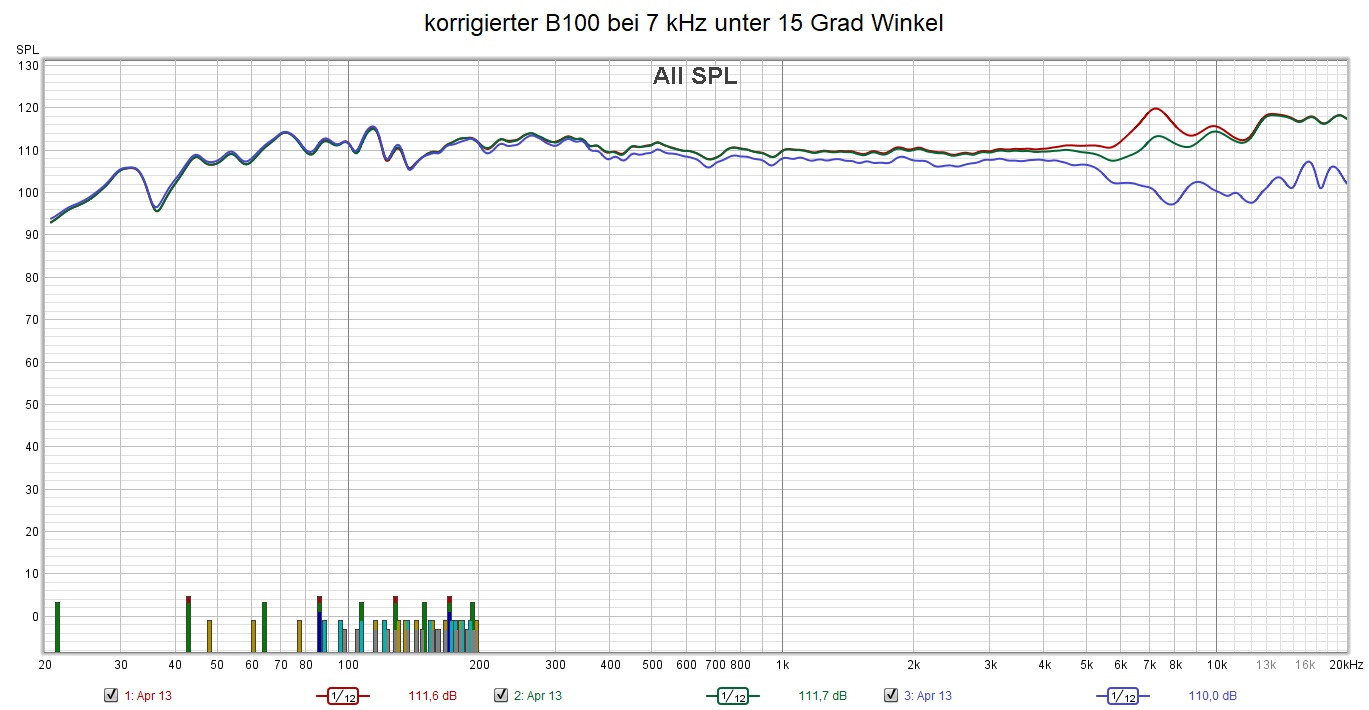 Man bekommt den B100 super glautgebügelt 2 EQs bei 7 und 13 kHz um 5 dB minus, ich glaube es war Q=1 oder etwas weniger, ... nur wirkt sich das im realen Hörversuch vollkommen dramisch aus, denn der weggebügelte Hochton fehlt unter Winkel vollkommen, ... dann dachte ich dann ziehe ich vollflächig über zwei Oktaven wieder hoch, dann wurde das Klangbild noch dramatisch schlechter, ... viele hier im Forum und auch Timmermanns versuchen sich an der passiven Korrektur und missachten die Praxis, denn ohne Korrektur klingt der B100 schlicht weg frischer und freier, ... Das war von einigen eine große Erkenntnis aus dem Treffen in Karlsruhe