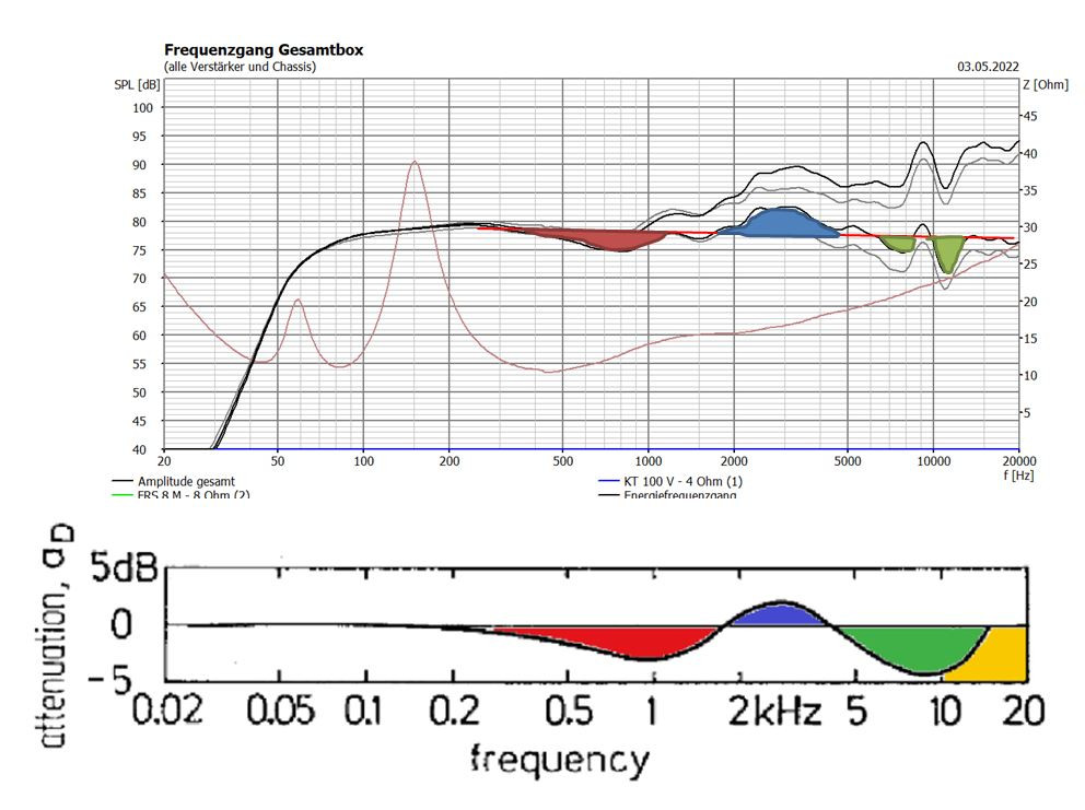 Ziel bei der Simulation war ein ansteigender Frequenzgang und möglichst gerader Energiefrequenzgang. Im Ergebnis ist der Mittelwert aus Energie- und Achsfrequenzgang ungefähr neutral.