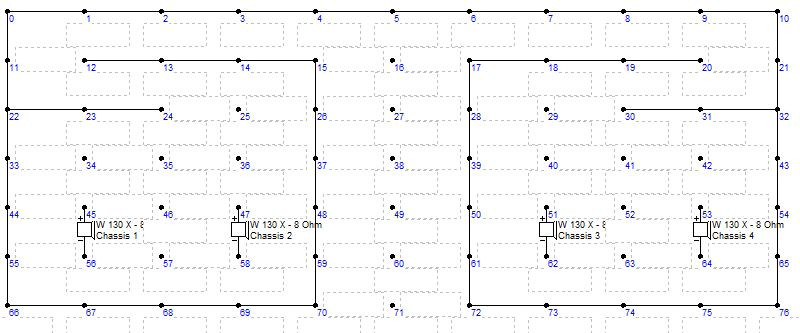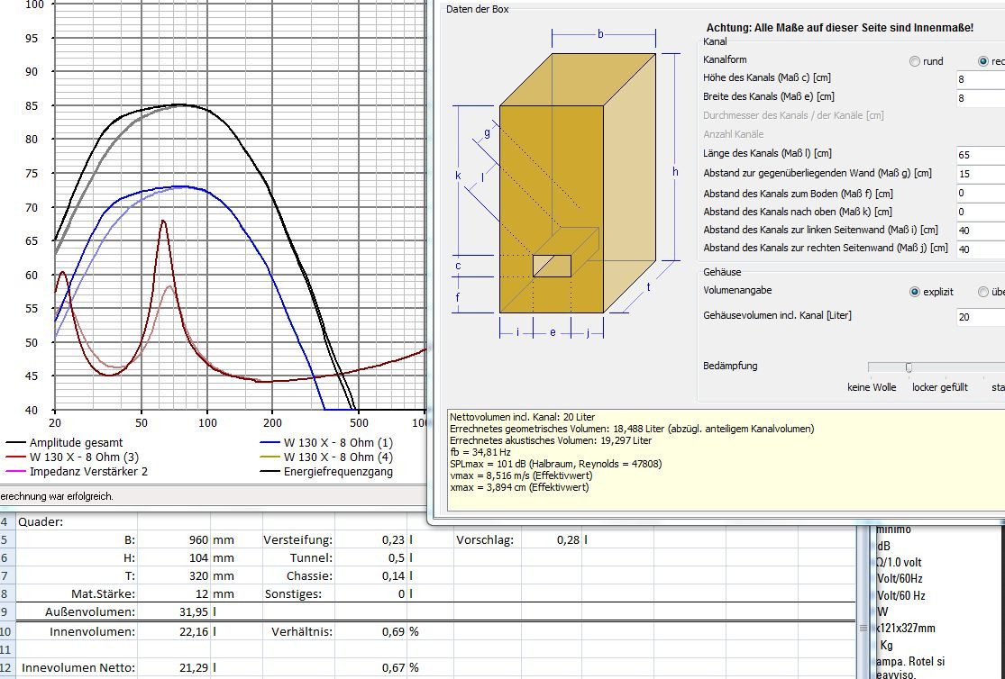 Da ich aus Platzgründen nur eine Höhe von max. 10 cm realisieren kann (soll unterm TV-Tisch stehen), kommt nur ein sehr kompakter Tieftöner in Frage. Um einen brauchbaren Wirkungsgrad zu erzielen, würde ich daher vier W130X nehmen; je zwei Treiber sollen parallel an je einem Ausgang der Endstufe angeschlossen werden. Das Außengehäuse soll ca. 32x96x10cm groß werden; jedes Chassis soll im eigenen Bassreflex-Gehäuse sitzen, der Kanal als Bodenport (eckig) ausgeführt werden. Alle vier Innengehäuse sollen identisch sein.