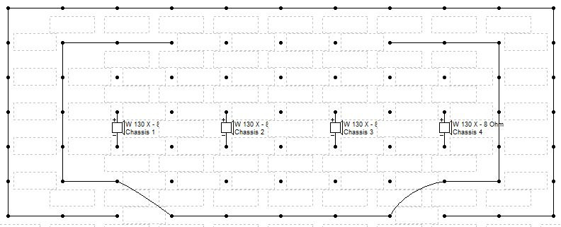 So, hier kommt die Zeichnung. Letztendlich sind es drei geworden, allerdings mit annähernd gleichen Eigenschaften: Das Außengehäuse ein wenig kleiner (32 x 92 cm) komme ich nun jeweils auf ca. 20 Liter (4.6 pro Chassis) und Fb = 36 Hz, BR Kanal ca. 60 cm lang.