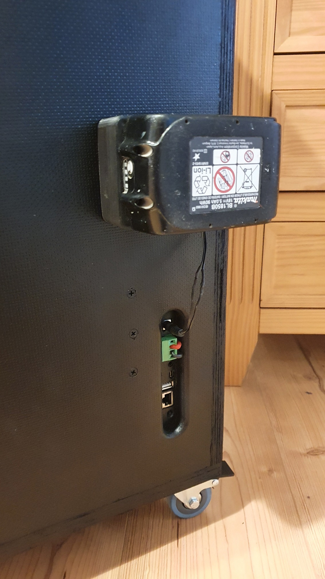 Per Jumper kann man zwischen Stereo und Mono schalten, es sollten also 100Watt Mono rauskommen. Als Akku Lösung wurde per 3D Druck eine Makitka Akkuhalterung gedruckt, Metallklingen eingeklebt und per Kabel angelötet. Ein voller Makita Akku Leistet knapp 18-20V. Soweit so gut, damit läuft alles tadelos und der Klang geht voll in Ordnung.