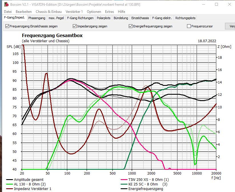 Ja, genau am Hörplatz mit senkrechtem Mikro zur Decke, die ein riesiger Mitteltonabsorber ist. Ok, dann suche ich mal 2 x 2,2 Ohm. 15 mF Spulen und 220 uF Kondensatoren sind bestellt. Theoretisch könnte ich auch einen TIW 250 XS in das Gehäuse quetschen. Der wäre für die offene Montage robuster. Sähe aber komisch aus mit den runden Ecken hinter dem Chassis. Der AL 130 hat eine passende Aussparung, die auch nach unten zeigen könnte.