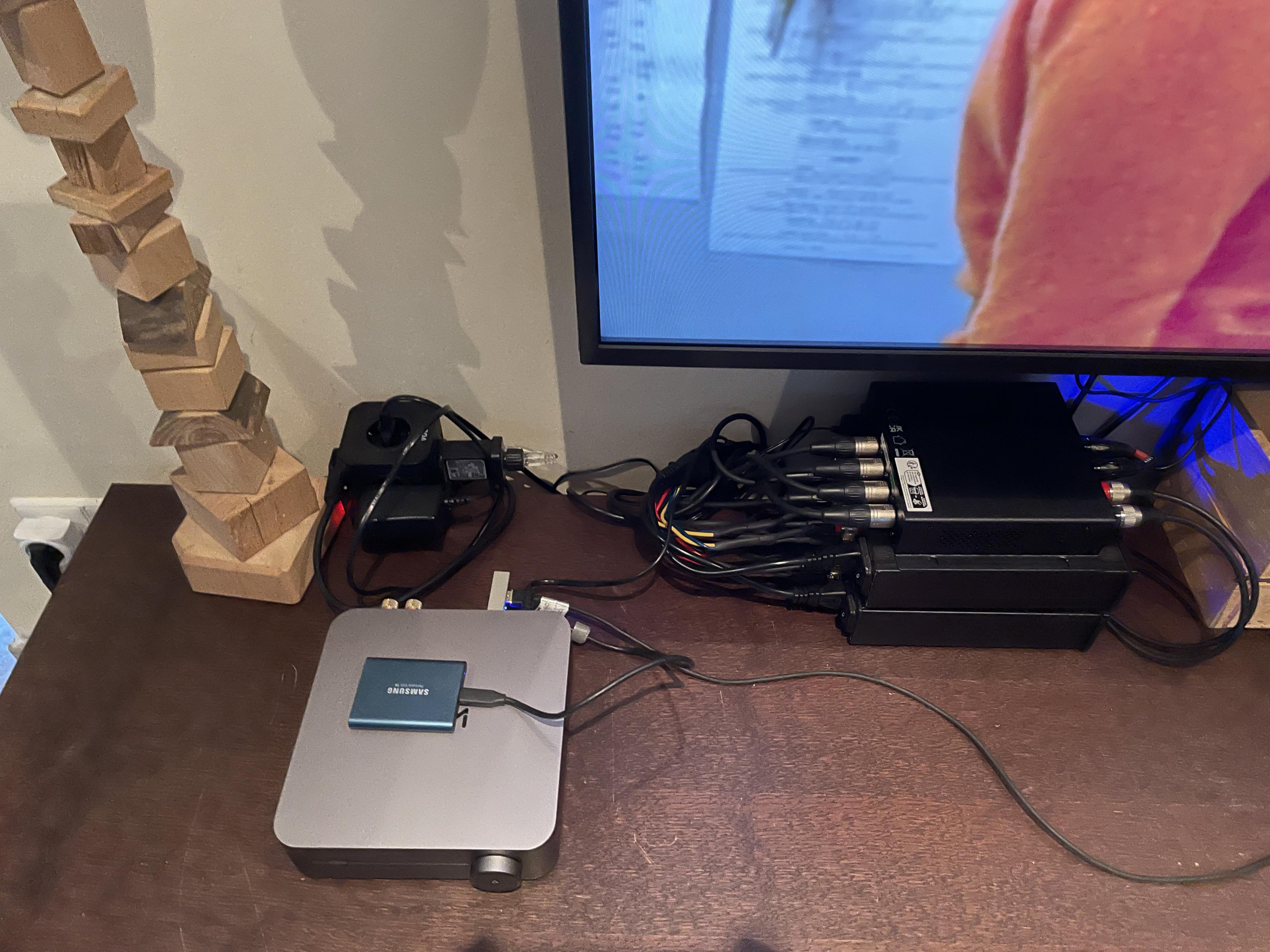 HD-->WIIM AMP USB --> FosiDAC --> TRACKS 4er Weiche --> auf zwei AMPs aufgesplittet, in die Lautsprecher.