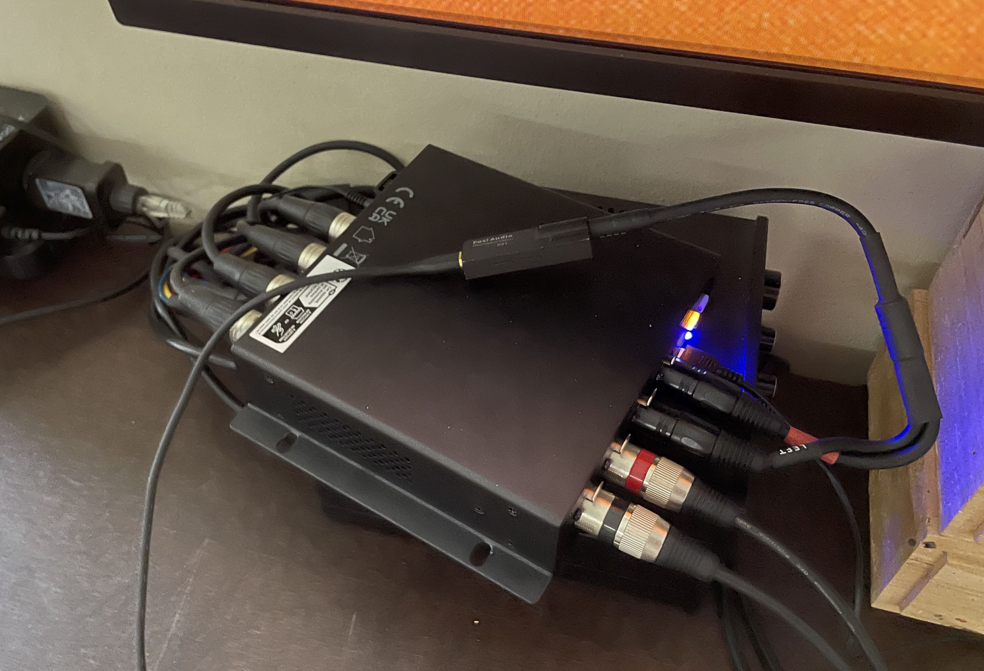 beim Einsatz der Thomannweiche war mir trotzdem immer noch wichtig, dass ich irgendwie den WIIM AMP mit einbinden kann. Ein Manko dieses AMPs war die ganze Zeit, dass er KEIN Vorverstärkerausgang hat, ... vor längerer Zeit gab es ein Update, seitdem gibt es die Möglichkeit per USB die digitalen Signale abzugreifen, mittels eines DACs hat man dann den Vorverstärkerausgang, ... da auch eine externe Festplatte am USB hängt, habe ich einen Zweifach-USB gebraucht.