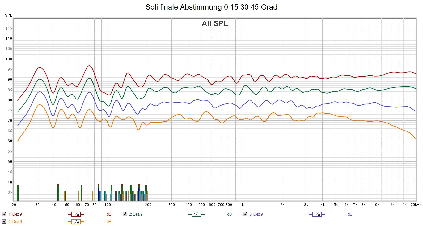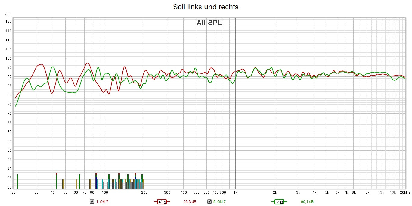 Die letzten Messungen der Soli möchte ich unkommentiert nochmals einstellen. Da ist sicher noch Potential genug, diese zu verbessern. Es laufen zwei China AMPs und das Audaphon DSP 24 das die untere Trennung übernommen hat bei 600 Hz und eine leichte Tiefbassanhebung von 3 dB macht.
