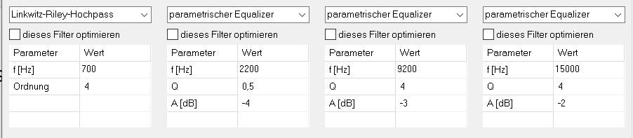 Heute war mir nur wichtig einen Übergang zwischen MT und HT zu bekommen, der von der Phase her in Ordnung ist. Der Rest der Abstimmung sollte einfach über die aktive Korrektur gehen. Meine nächsten Abstimmgedanken gehen in Richtung, was für eine Trennung soll ich wählen? LR4 oder LR2 oder eine Kombination oder doch BUT? In der Simulation sieht nämlich BUT2 im Hoch und Tiefpass auch nicht so schlecht aus, aktuell bin ich bei BUT2 bei 700 Hz im Tief- und Hochpass.