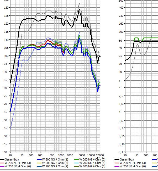 Jetzt hab ich mal eine Schallwand mit 8 Chassis gebastelt, je 4 in Reihe und dann die beiden Blöcke parallel verschaltet ergibt 8 Ohm.