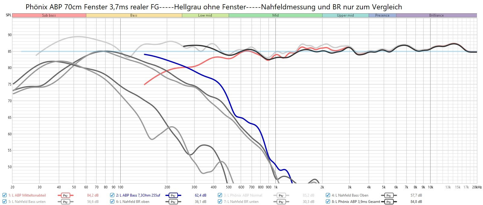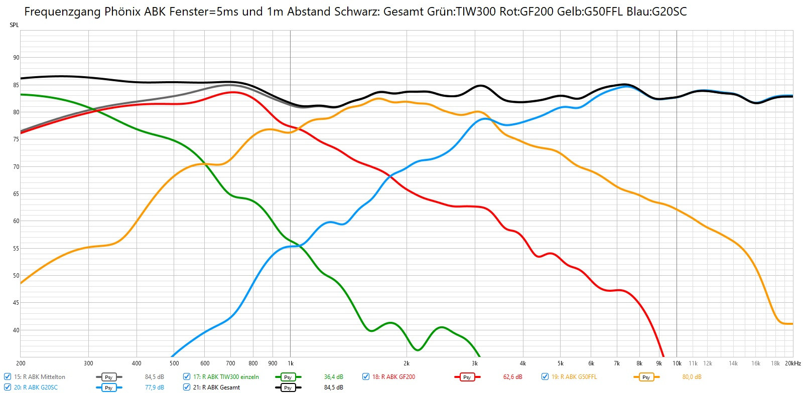 Die Messungen sind natürlich jetzt keine perfekten Labormessungen und ich hoffe ich habe im Setup keine Fehler eingebaut.Ich bin ja auch noch Anfänger. Scheint aber alles plausibel und ich hab geschaut immer die gleiche Aufstellung bei den Messungen zu haben. Mikrofon ist von HIFI Selbstbau kalibriert und 2-Kanal mit einer Focusrite 2i2