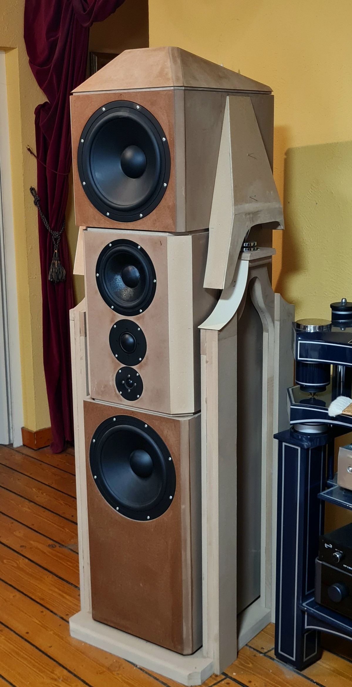 Mein Augenmerk habe ich diesmal auf zwei Sachen gelegt. Gutes Phasenverhältnis und Entlastung der einzelnen Wege. Die Weiche ist etwas überkomplex geworden, aber ich denke das Ergebnis stimmt soweit. Vielleicht werd ich aber auch bald wieder über mein "Konstrukt" lachen.