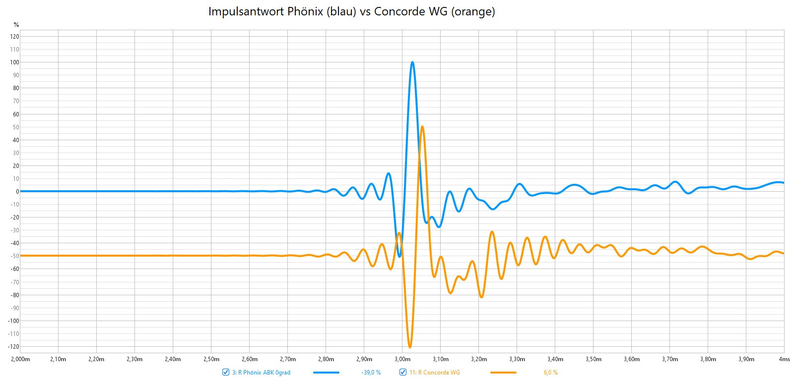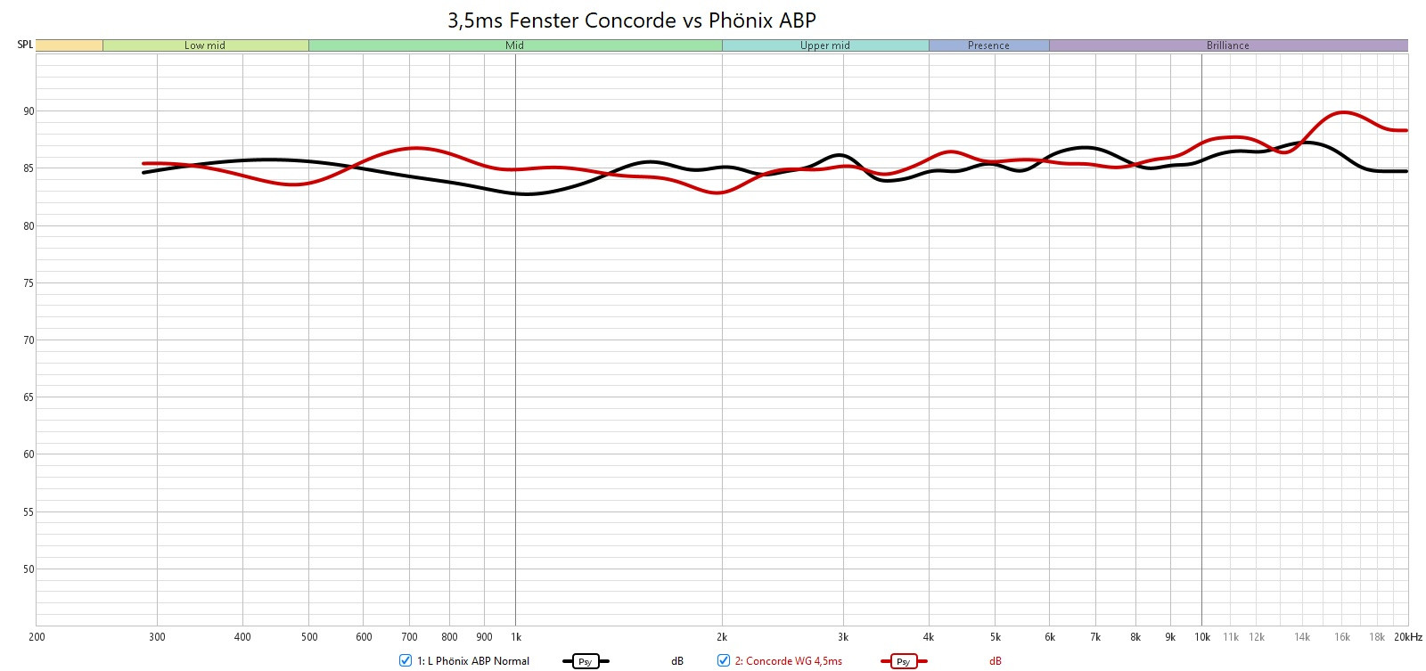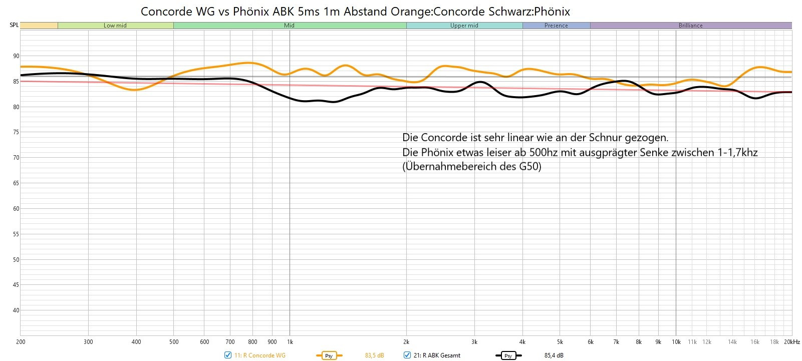 Mit der Concorde WG verglichen, wie man sieht ist sie ab 500hz etwas lauter und sehr linear. Die Phönix ist im Hoch-/Mittelton etwas zurückhaltender und leicht abfallend.