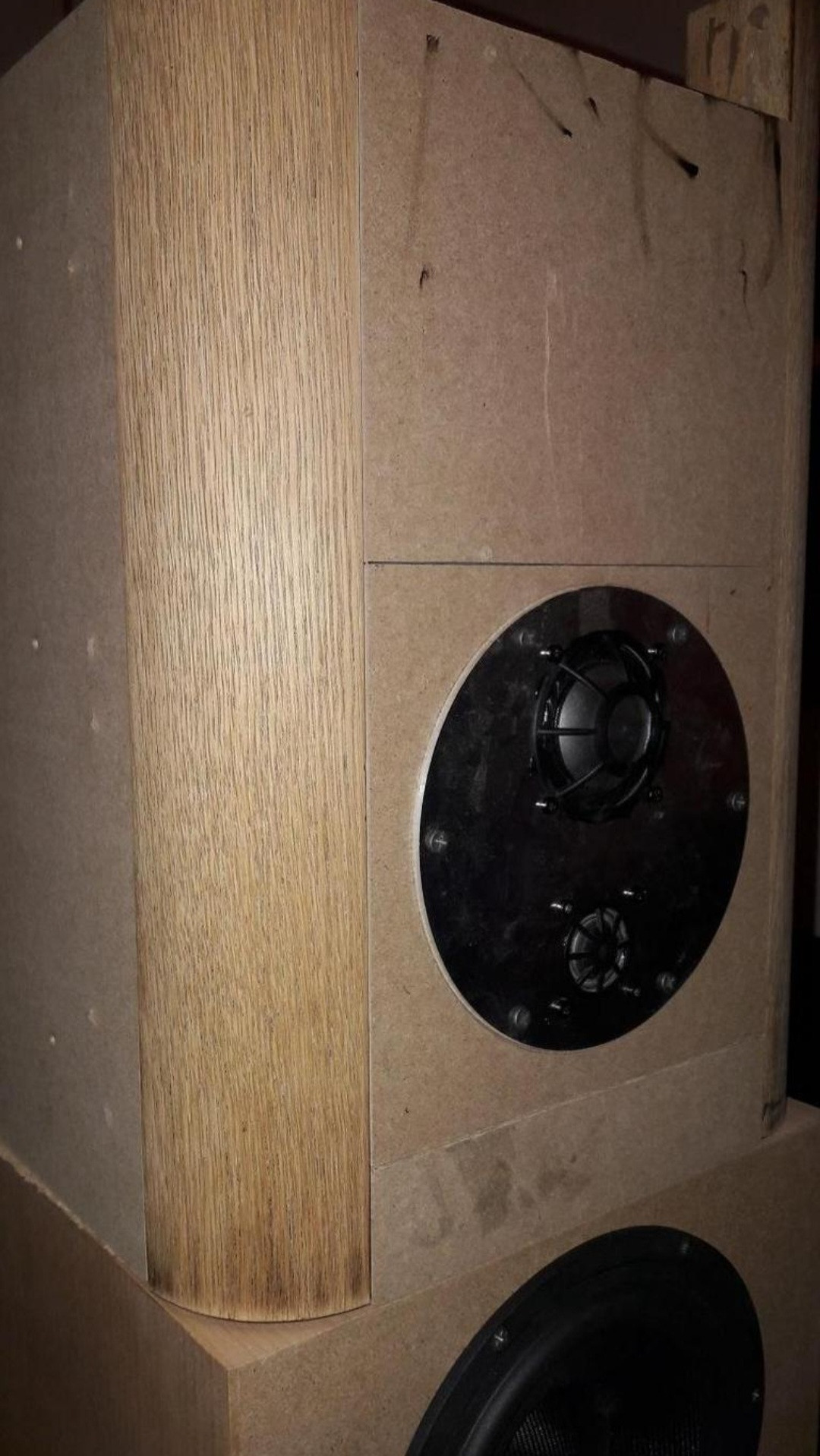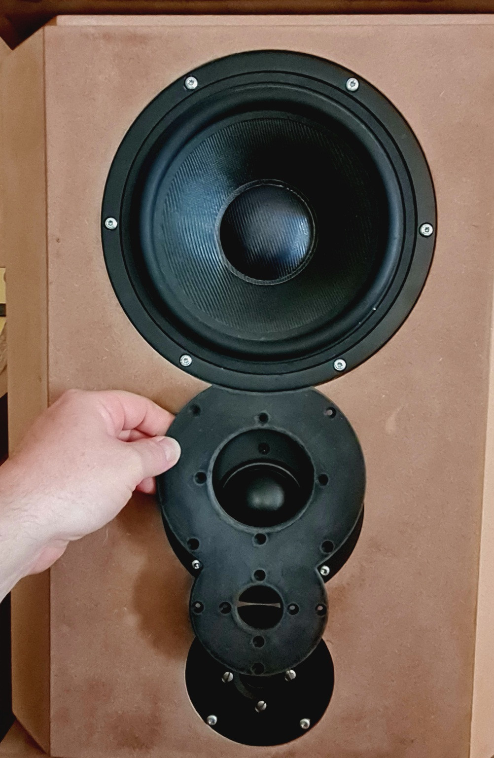 Das Mitteltongehäuse wird irgendwann auch nochmal neu gebaut. Ich hab mir eine Blenden für G50 und SC20 mittels 3D Druck machen lassen um den Mittelton ganz dicht zusammen zu rücken.Diese muss aber noch verbessert werden. Fasen sollen dann 8cm Breit werden und rund ausgeführt.