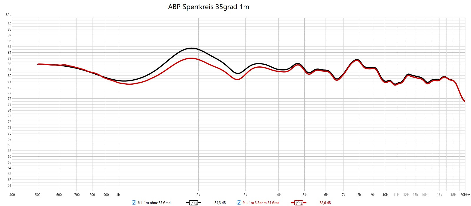 Auch hier ist der Bereich 3-4 kHz bei 30 Grad etwa 2 dB zu laut. Sicher kein Drama. Das WG müsste etwas stärker bündeln. Aber die Delle bei 2 kHz existiert nicht real.
