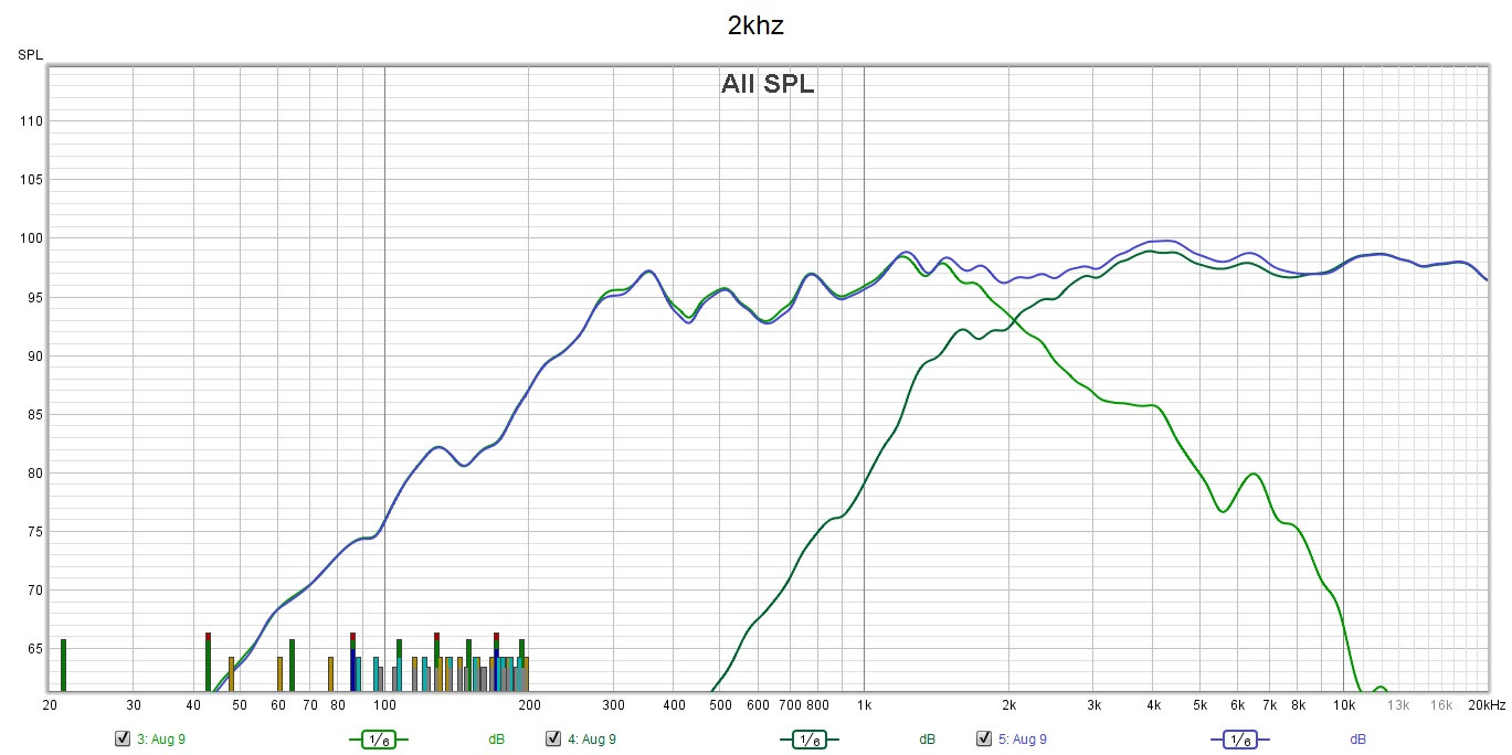 und etwas unübersichtlich, aber ich wollte natürlich noch die Trennfrequenz untersuchen, und jetzt wird es gruselig: genau der gleiche Punkt bei 1kHz: