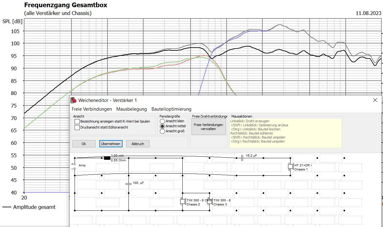Ich habe aber etwas gemogelt, der Hochton ist bei der passiven Weiche um 2 dB am Verstärker angehoben, sonst wäre zu wenig Hochton vorhanden.