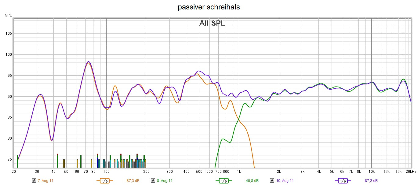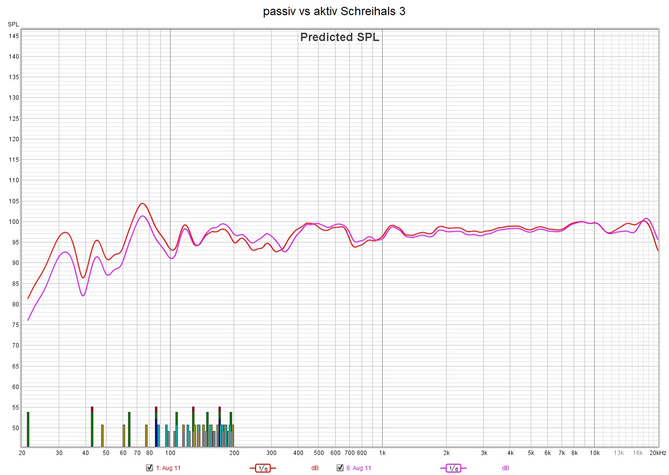 ja, habe ich gerade eben gemacht, es läuft aktuell nur die passive Weiche ohne jeglichem DSP ... Mittenfrequenz bei 4 kHz beim AMT bedeutet 6.8 Ohm und 4,7µF und 0,33mH(klein). dann sieht es im Vergleich aktiv zu passiv so aus: passiv ist die, die im Bass etwas weniger bringt.