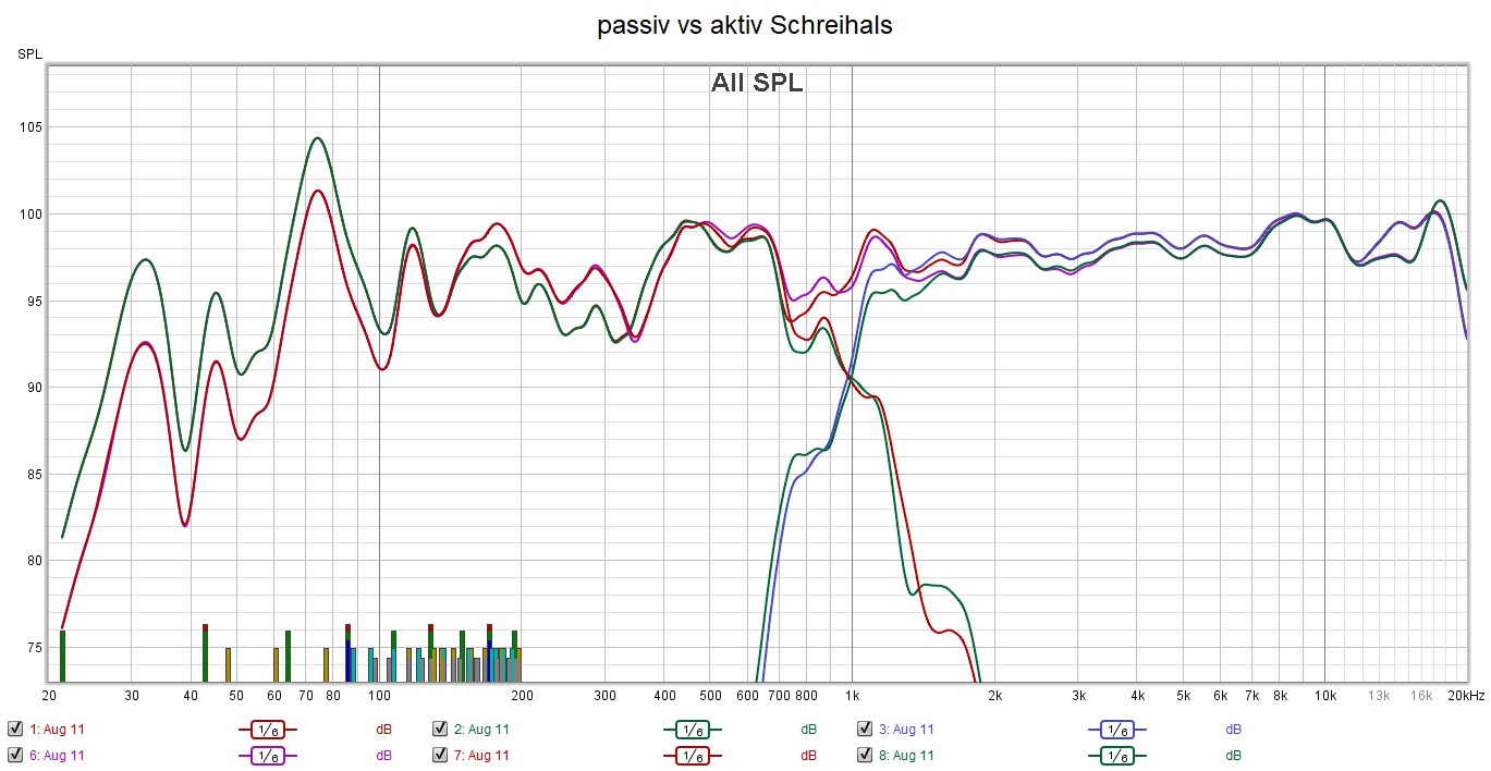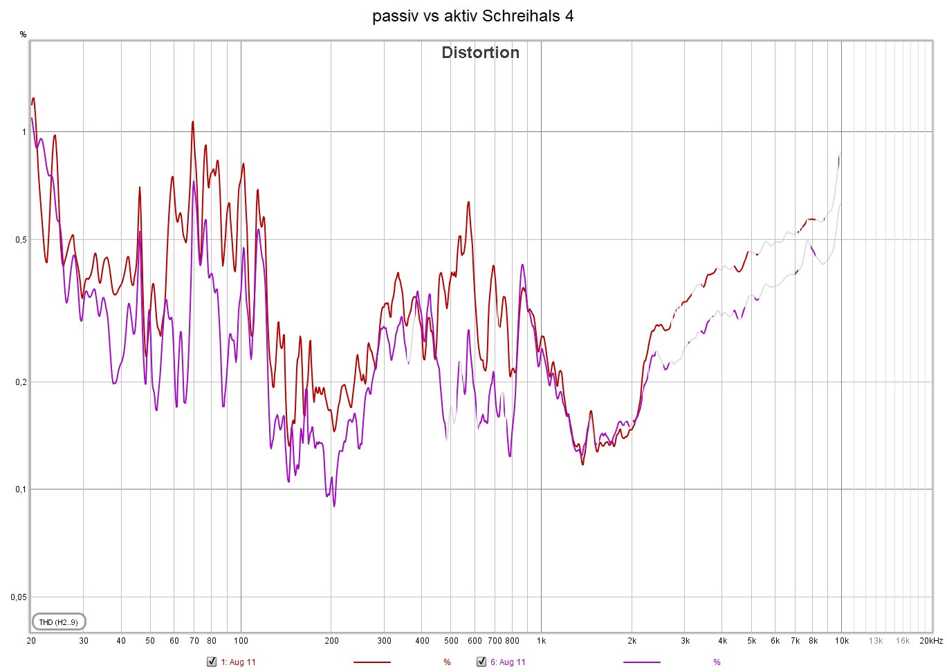 interessant ist dass die passive Variante im unteren Mittelton etwas weniger Klirr hat, ... vielleicht wegen 2 Wege anstatt 2,5 Wege?
