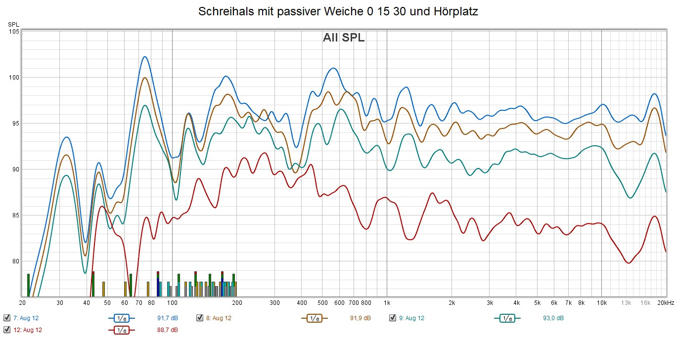 der Peak bei 600 Hz rum, werde ich nicht wegnehmen, denn dies habe ich über Wochen gehabt und da hat mir etwas gefehlt, ... in der 2 Metermessung ist es schön zu sehen, dass dieser in der Entfernung stückweise verschwindet.