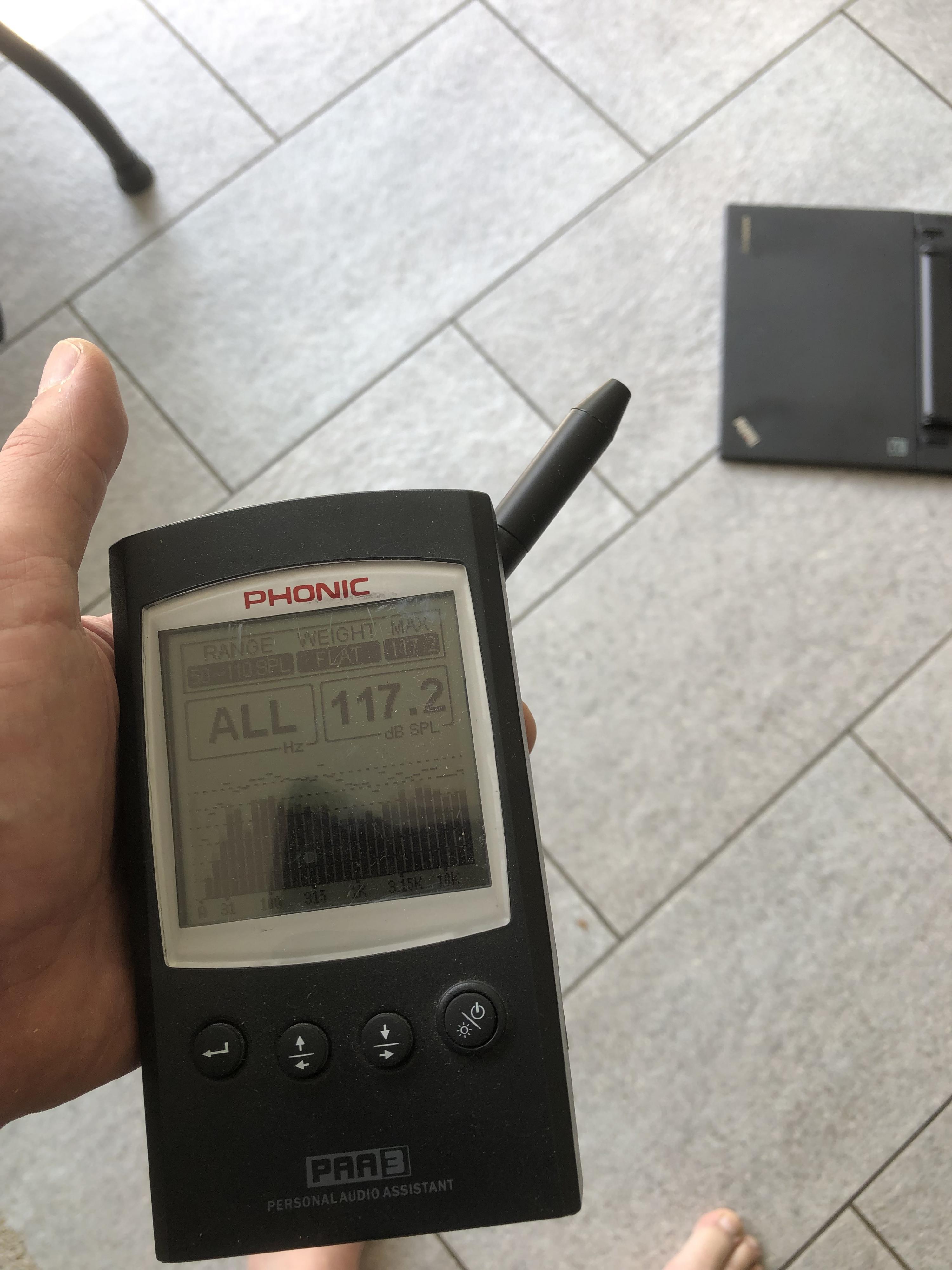 und dann habe mal kurz aufgedreht: noch nicht voller Pegel, aber einfach mal einen Dreh nach rechts: ist so in einem Meter Abstand gemessen, und dann, man sieht es auch auf dem Bild hat sich der Lapptop am Boden gemütlich gemacht, ich hatte Glück im Unglück, alles heil geblieben: