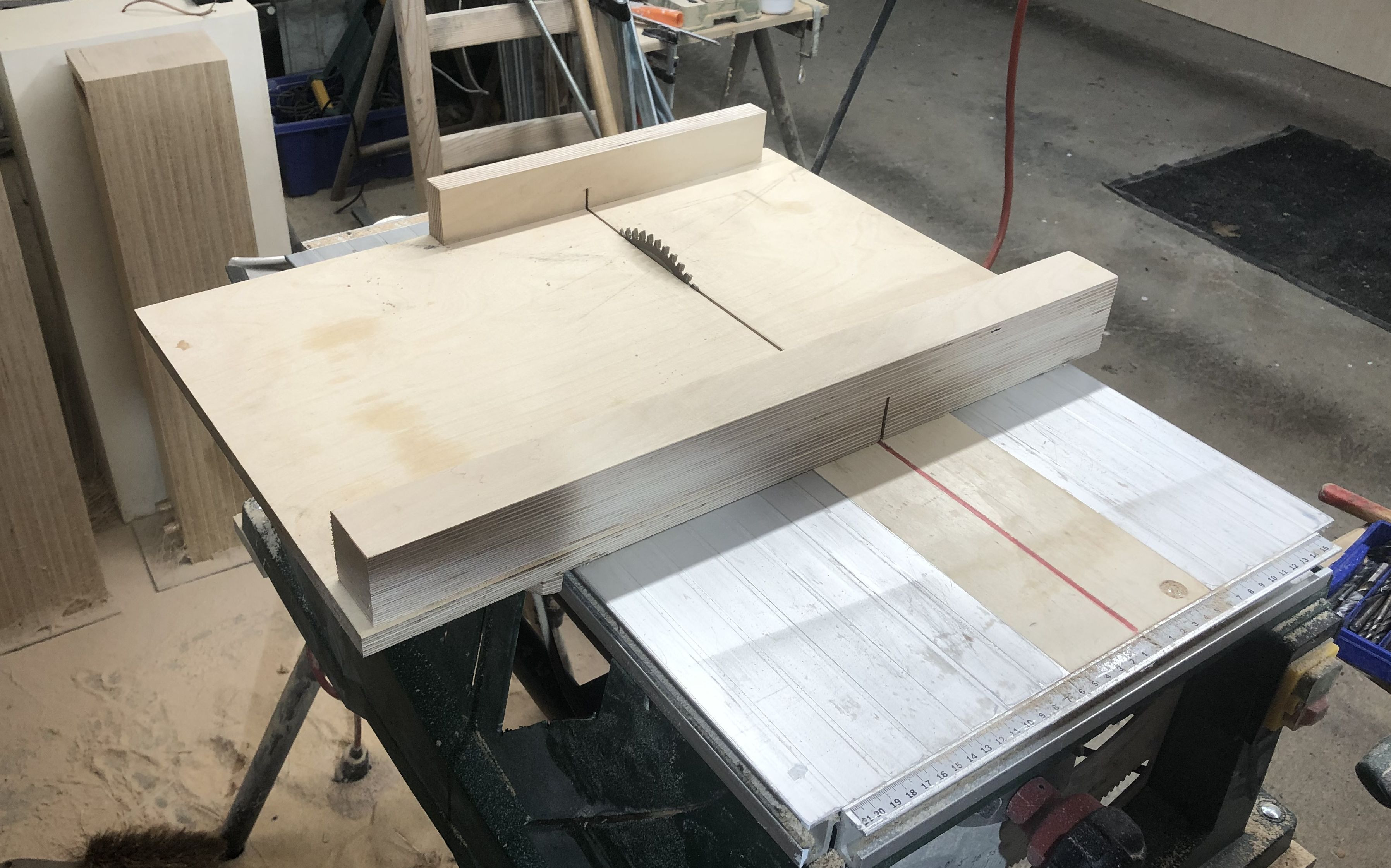 und die Säge dazu hat auch zwei Funktionen, ein zusätzlicher Schiebeschlitten macht die Teile winkelig. Sehr häufig in der Vergangenheit ist genau das mein Problem, dass die Boxen zu große Spalte hatten, ... wenn die Rohteile vorher schon hundertprozentig genau in der Dimension und in der Winklichkeit stimmen, kann schon beim Zusammenleimen nichts mehr schief gehen, ... leider war auch dieser Schiebeschlitten etwas klein für den Schreihals, sodass ich auch hier etwas länger gebraucht habe, die Winklichkeit hin zu bekommen, meine Boxen die ich ohne weiteres bauen kann sind max 90 x 38 x (von 10 bis 25) cm3 Höhe Tiefe Breite