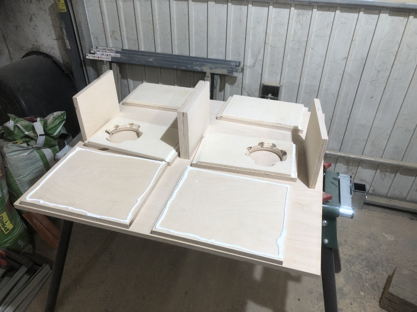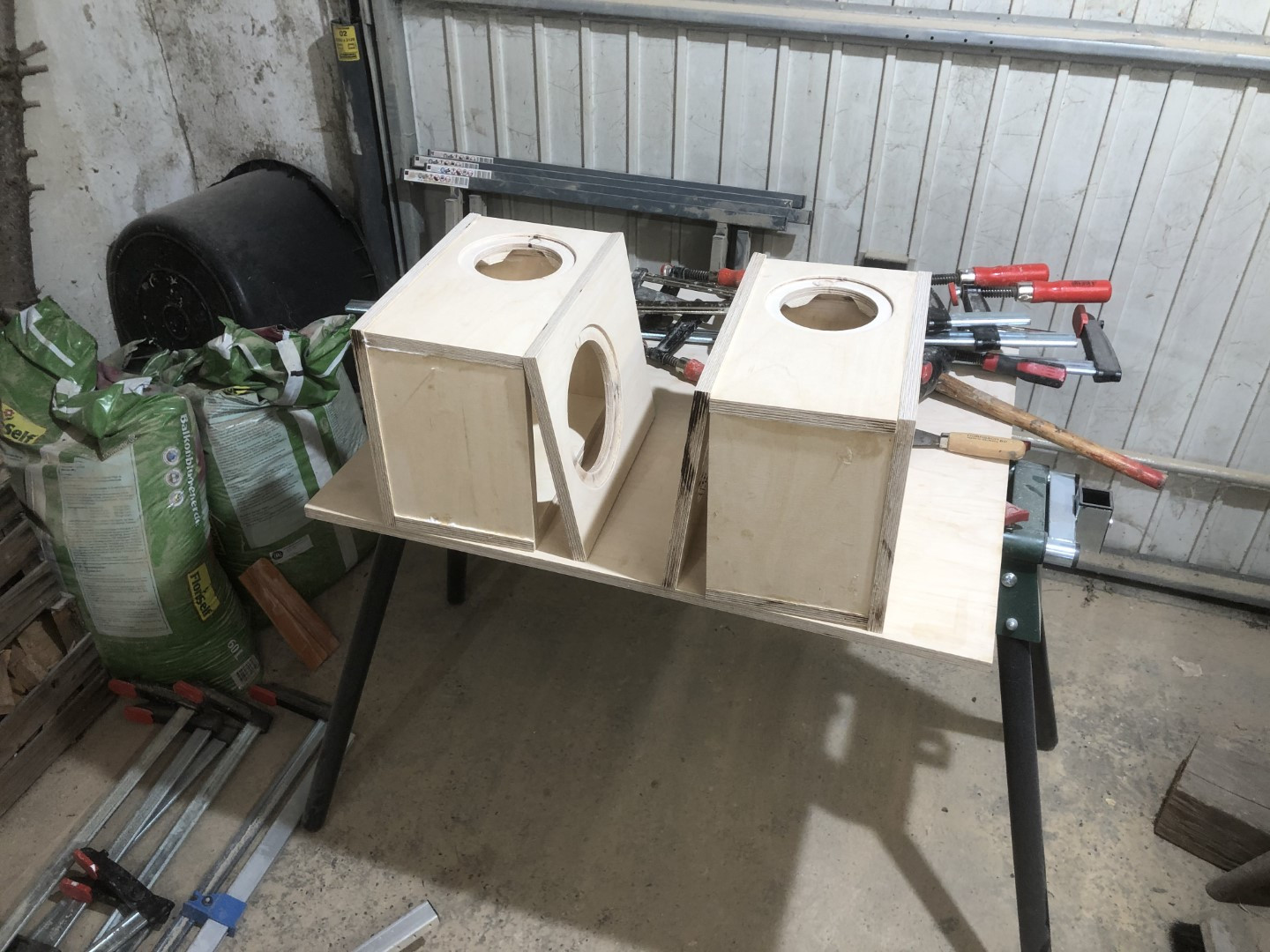 Das letzte wo ich enorm Zeit spare sind meine Arbeitswege in der Garage, ... ich baue die Boxen auf maximal 3x3 Meter Platz, die Arbeitswege sind super kurz, alle Werkzeuge, die ich brauche sind in sehr kurzer Distanz direkt greifbar. Säge, Ablegetisch/oder auch Teiletisch, Verleimstation, Bündigfräser als Frästisch, Bandschleifer und Handschleifklotz, Oberfräse zum Einfräsen.