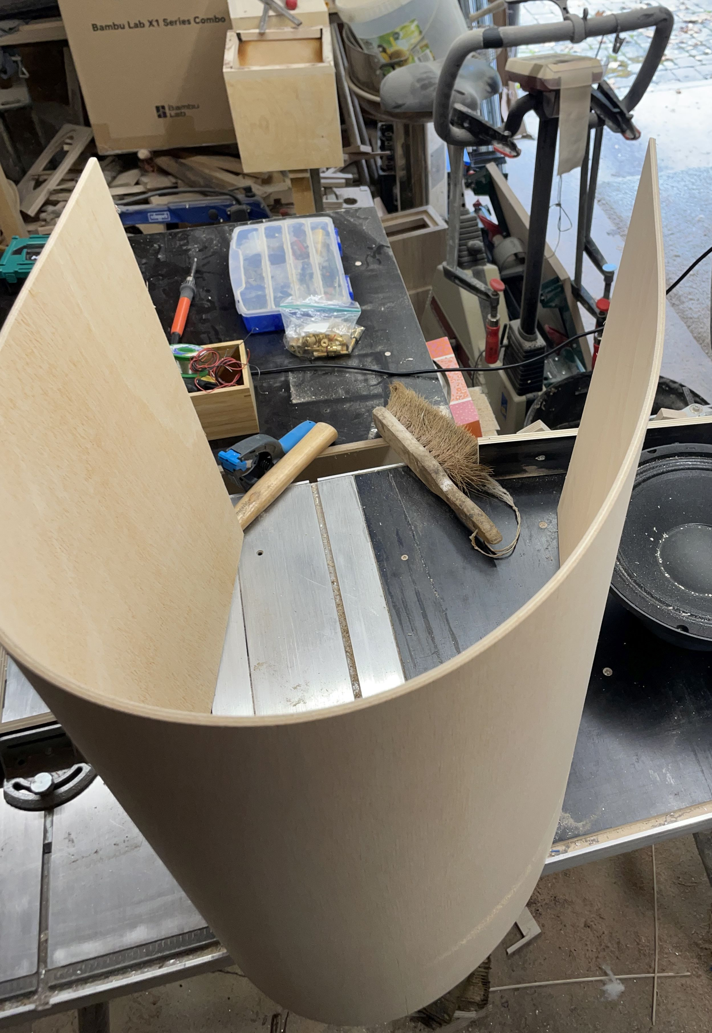 Es wird drei abgetrennte Einzelvoluminas geben, da sie Seitenwände recht dünn werden, brauche ich eine Versteifung in verschiedenen Höhen und anstatt ich die öffne, quasi als Ringversteifung, lasse ich die Bretter einfach geschlossen. Bei den TIW300 ist in CB sehr viel Potential, dass auch eine sehr laute Box dabei rauskommt.