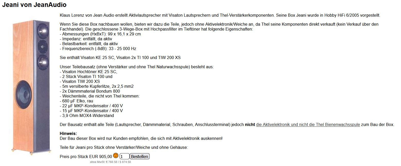 welche ich mehrmals hören durfte. Eine ganz tolle Vorstellung lieferte das kleine Teilchen in Gelsenkirchen auf einer Messe, wobei es an diesem Tag noch eine zweite Überraschung gab, die Rocket von Hifi-Selbstbau, aber andere Geschichte. Die Jeani von Jean Audio war mit einem Aktivmodul von Thel ausgestattet, was ganz hervorragend eingestellt, super gut funktionierte.