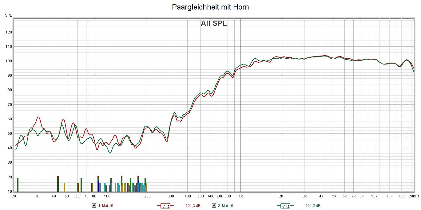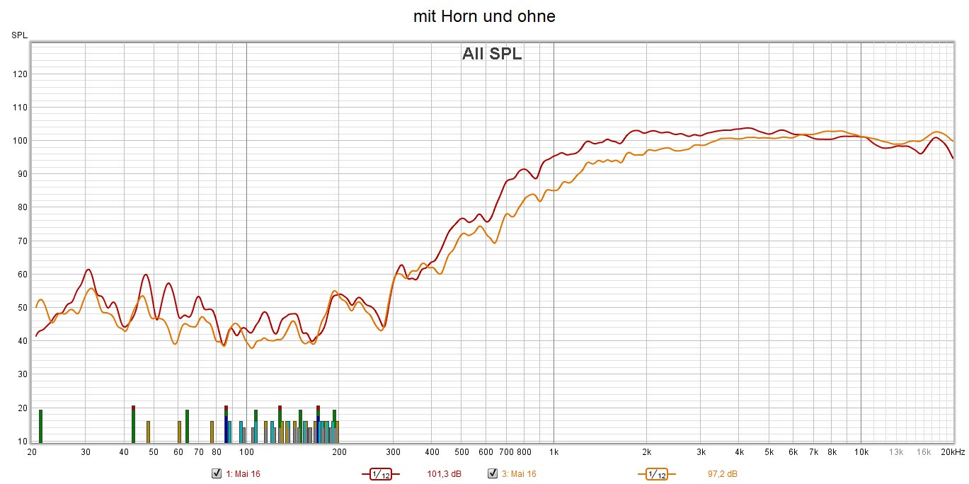 Das "Horn" bringt unter 2kHz etwas zusätzlichen Pegel, der bei PA sicher nicht schadet. Ohne Horn und dafür über 2kHz etwas Pegel weggenommen ist für deine Anwendung ggf. die bessere Lösung, 95dB Empfindlichkeit sind ja immer noch ein Wort. Der Übergang in der Bündelung dürfte aber ungünstiger werden.Zitat von Timo Beitrag anzeigenDas ist eine wirklich wichtige Information. Die ich gleich nach Fertigstellung teste. Einmal mit Horn und einmal ohne. So wie ich die Messungen deute gehen ohne Horn die Verzerrungen zurück.Gruß Klaus