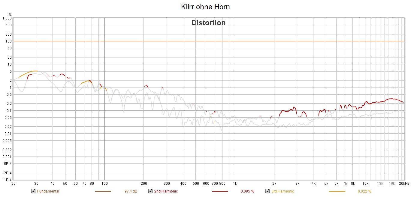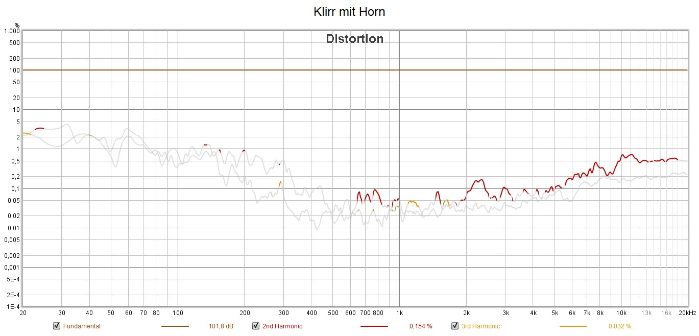 mit Horn messe ich in einem Meter Abstand in der Tat einen höheren Superhochtonklirr, eine Klirrspitze bei 100dB und bei um die 2 kHz zeigt kaum Unterschiede (Horn 0,15 zu ohne Horn 0,095 Prozent K2). Immerhin würde man mit dem EQ ohne Horn anheben müssen um dann wieder, vermutlich, bei gleichem Klirr wie mit Horn zu landen, ...