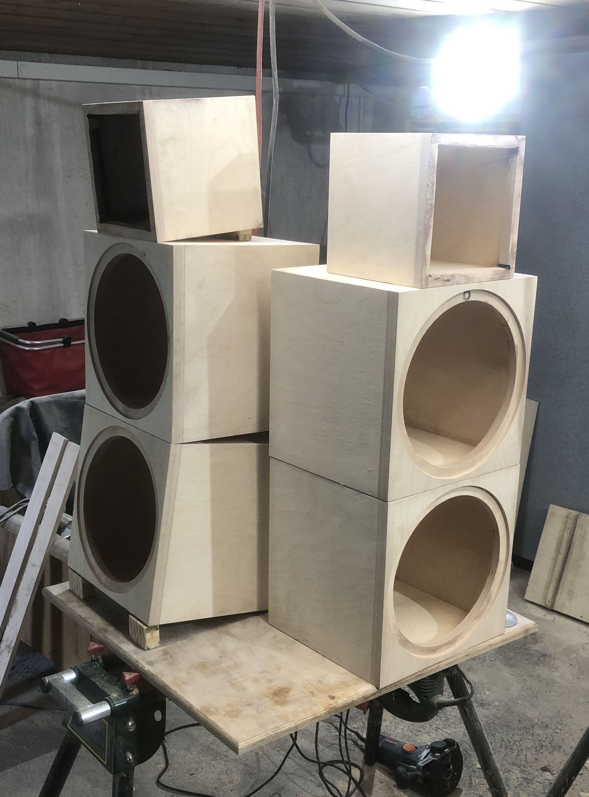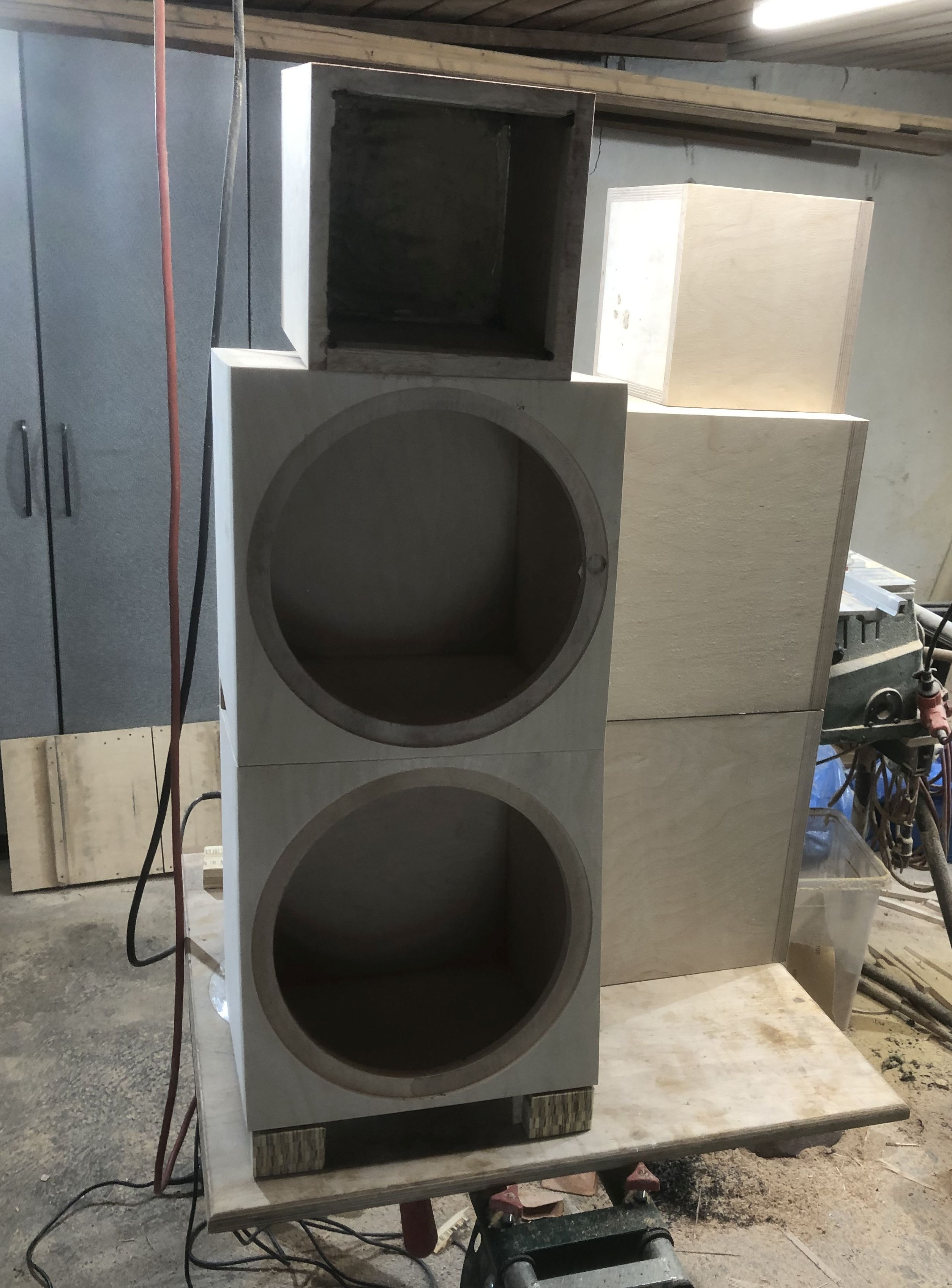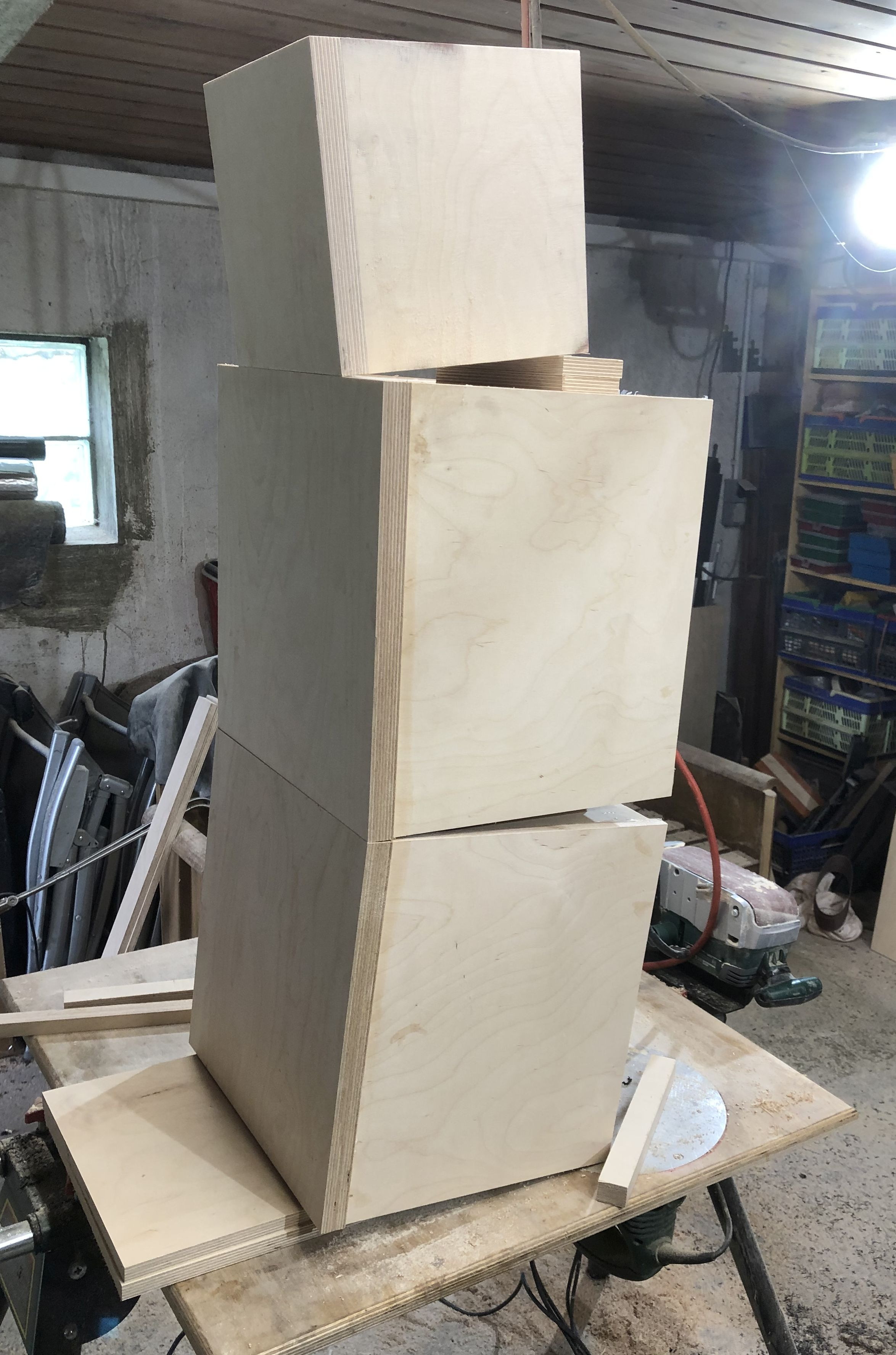 die Gehäuse machen mir, in MPX gefertigt, zusätzlich einige graue Haare. Die modulare Bauweise erfordert eine deutlich längere Schleifzeit, ... dies ist jetzt grob mit 80 Bandschleifer gemacht, ... die Maße stimmen, 350x350x320 und 230x230x230, die Maße für die Schrägstellung habe ich auch ermittelt, ... hier würde ich extra Abstandshalter anfertigen, ...