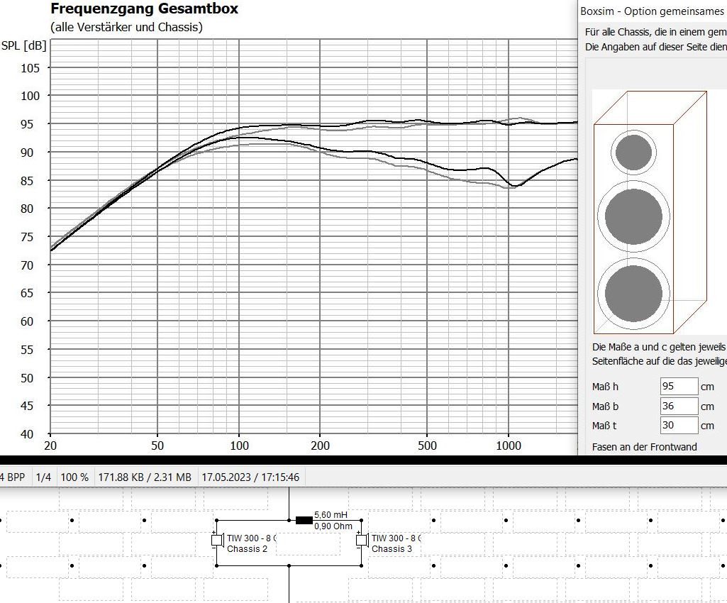 dagegen verringert sich der Mitteltonmaximalpegel, da nur noch ein Treiber im Mittelton spielt, aber der Treiber wird eher im Bass beschränkt, als im Mittelton, ...