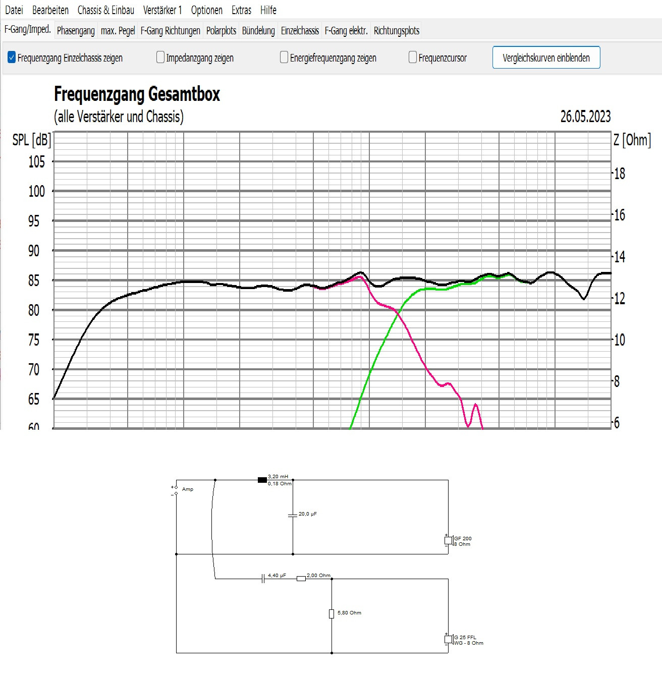 Zu der Trennung muss man sagen, dass sie schon unter der Resonanzfrequenz(1700Hz) des G25FFL liegt. Ob das gut oder schlecht ist würden bestimmt Messungen zeigen.