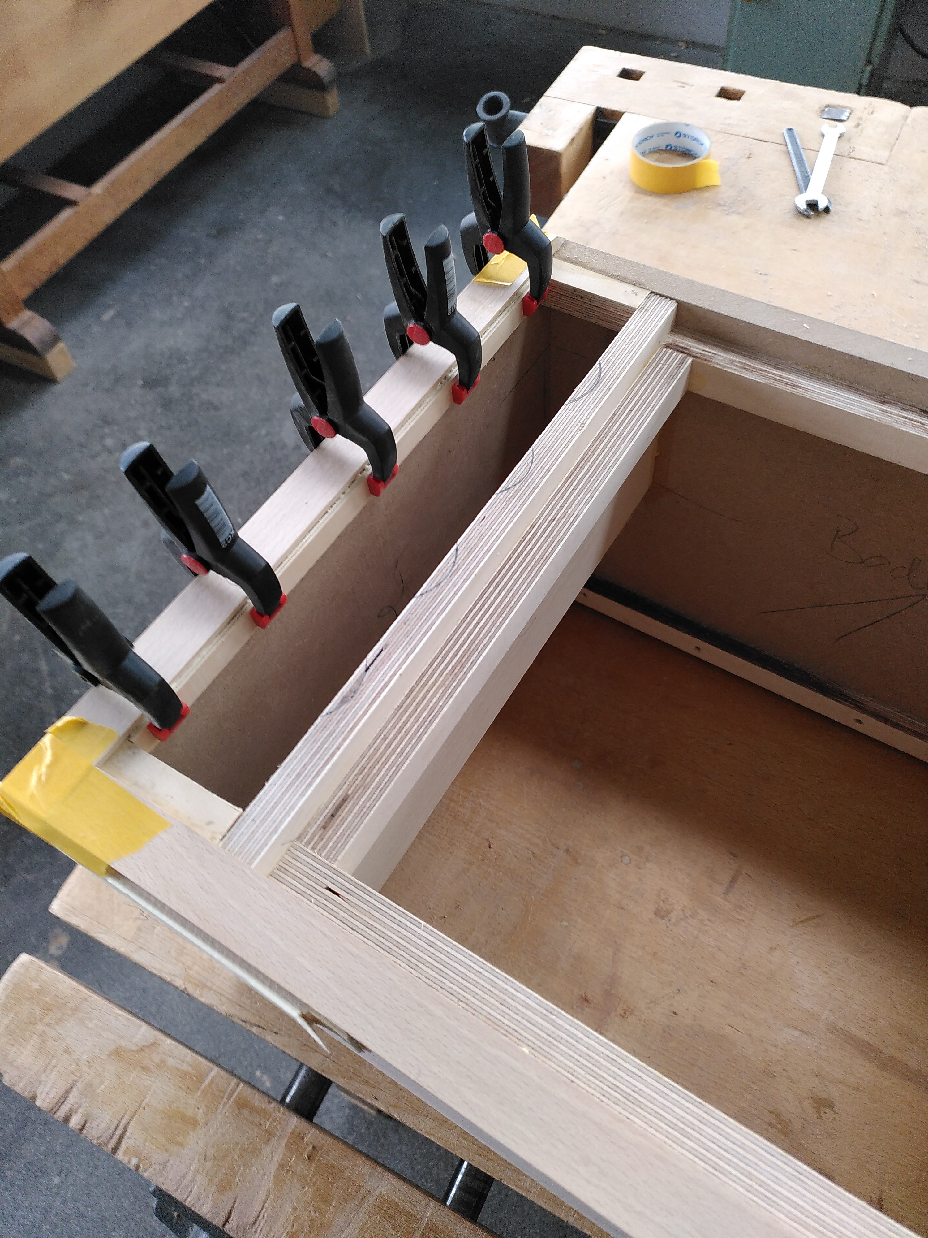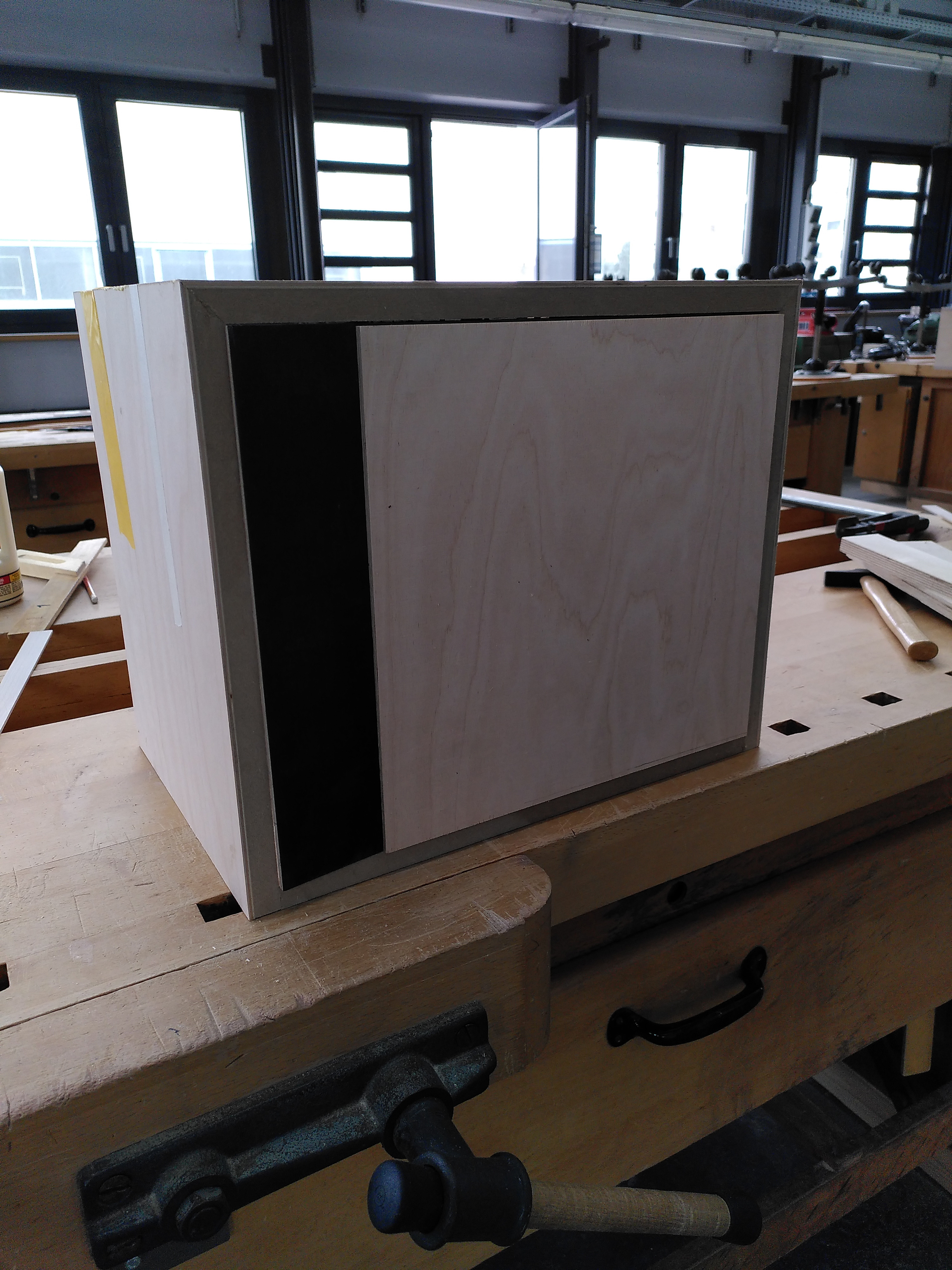 Front und Rückwand bekommen eine weiße Kunstlederbeschichtung, Seitenwände und Oberseite sind mit 4 mm Buchesperrholz beschichtet. Die werden nur gewachsen und / oder geölt.