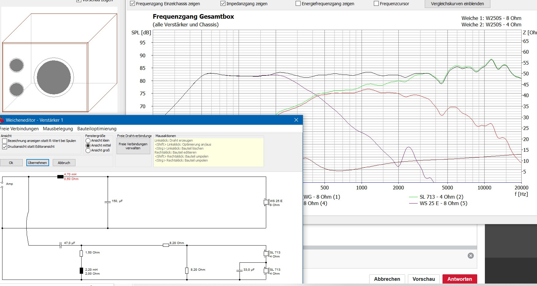 Das sieht gut aus, allerdings sehe ich mit bedenklichem Blick auf die 0,6 mm² Basspulen. Da hätte ich doch Angst, das die vor einem PAW 25 mit bis zu 450 Watt Musikleistung zu Heizspulen werden. Sie sind auch recht hochohmig. Nimmt man andere wird aber wieder die ganze Simu gräßlich.Zitat von Timo Beitrag anzeigender B80 bündelt nicht sehr stark, und den habe ich auch kaum angehoben, im Gegensatz zum B100, der unbedingt angehoben werden muss.