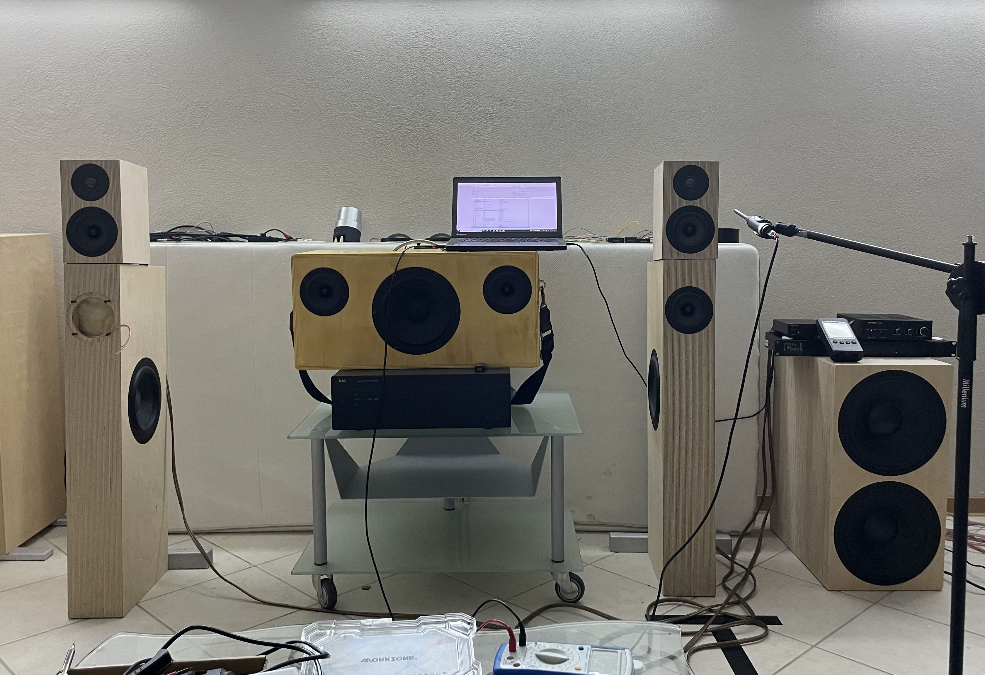 aktuell teste ich wieder die aktive Weiche von Thomann LR4 im Hoch- und Tiefpass bei 165 Hz und im Verstärkerbereich ein Topping bei den SATs und ein China Class D im Subbereich, übrigens Vollsymmetrischer Aufbau. Messungen mache ich demnächst im Wohnzimmer.