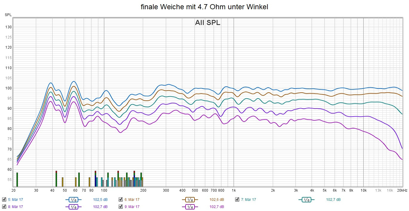 Am Wochenende fand ein etwas längerer Hörtest statt, mit der Thoman-Aktivweiche bei LR4 und 165 Hz, ... die erfolgreich im Trennungsbereich funktionierte, (Den Sub habe ich wie im Karlsruher Treffen 2023 um 90 Grad verdreht was den Übernahmebereich deutlich verbessert: Seitenbass), ... jetzt ist mir allerdings ein Bereich unter größeren Winkeln aufgefallen bei 2,5 bis 3,5 kHz, den ich noch passiv an der Weiche korrigieren möchte, ... Analysemessungen zeigen deutlich, dass der Widerstand parallel zum B100 etwas zu klein ist, der 2,2 Ohm wird durch ein 4,7 Ohm getauscht, ... Ich hatte dies zwar als alternative Variante schon gemessen, aber mich dann doch für den kleineren Widerstand entschieden, ... das senkt den Bereich um 3 Khz etwas ab, ... auf Achse ist mir das messtechnisch zuerst nicht so aufgefallen, aber ab 30 Grad kommt dieser Bereich sehr präsent hervor, was jetzt neuere Messungen zeigen ...