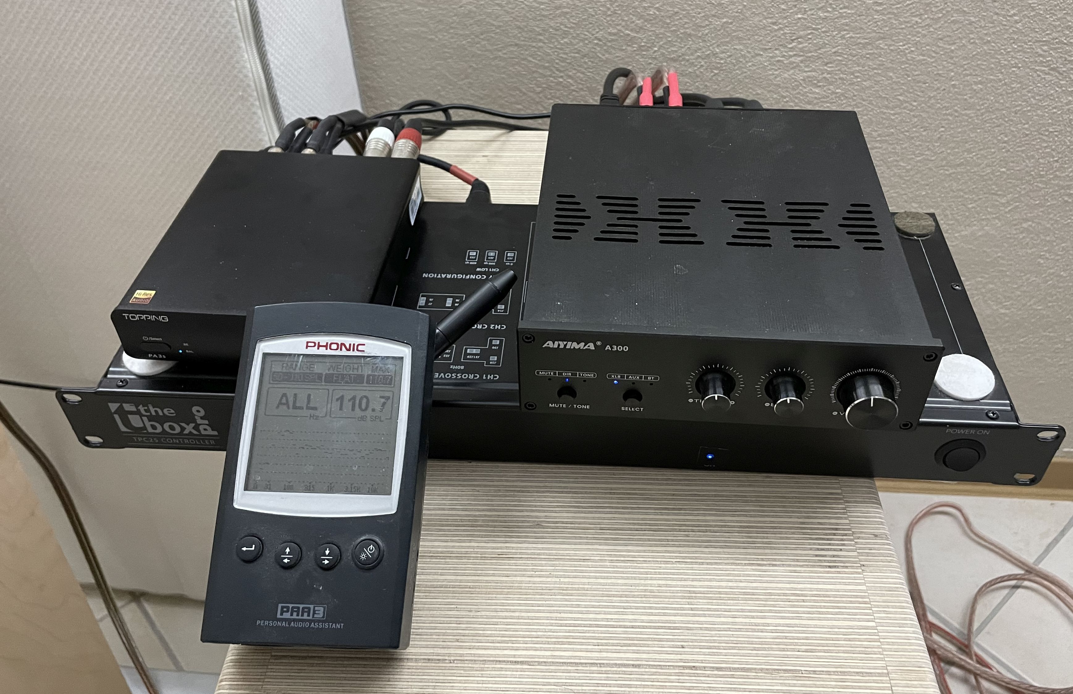 aktuell hängt nach dem Rechner ein FosiDAC in die Aktivweiche mit Trennung von LR4 bei 165 Hz, und Hochton der Topping Amp und im Sub ein China Class D Amp: