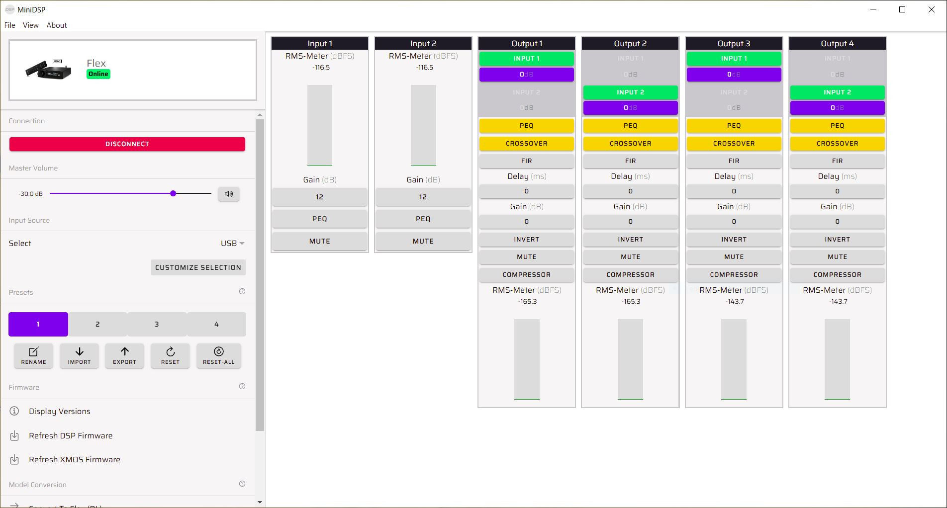 MiniDSP Flex, liegt seit vier Wochen im Keller und wartet auf den ersten großen Einsatz, Anschuss mittels Cinchkabel.