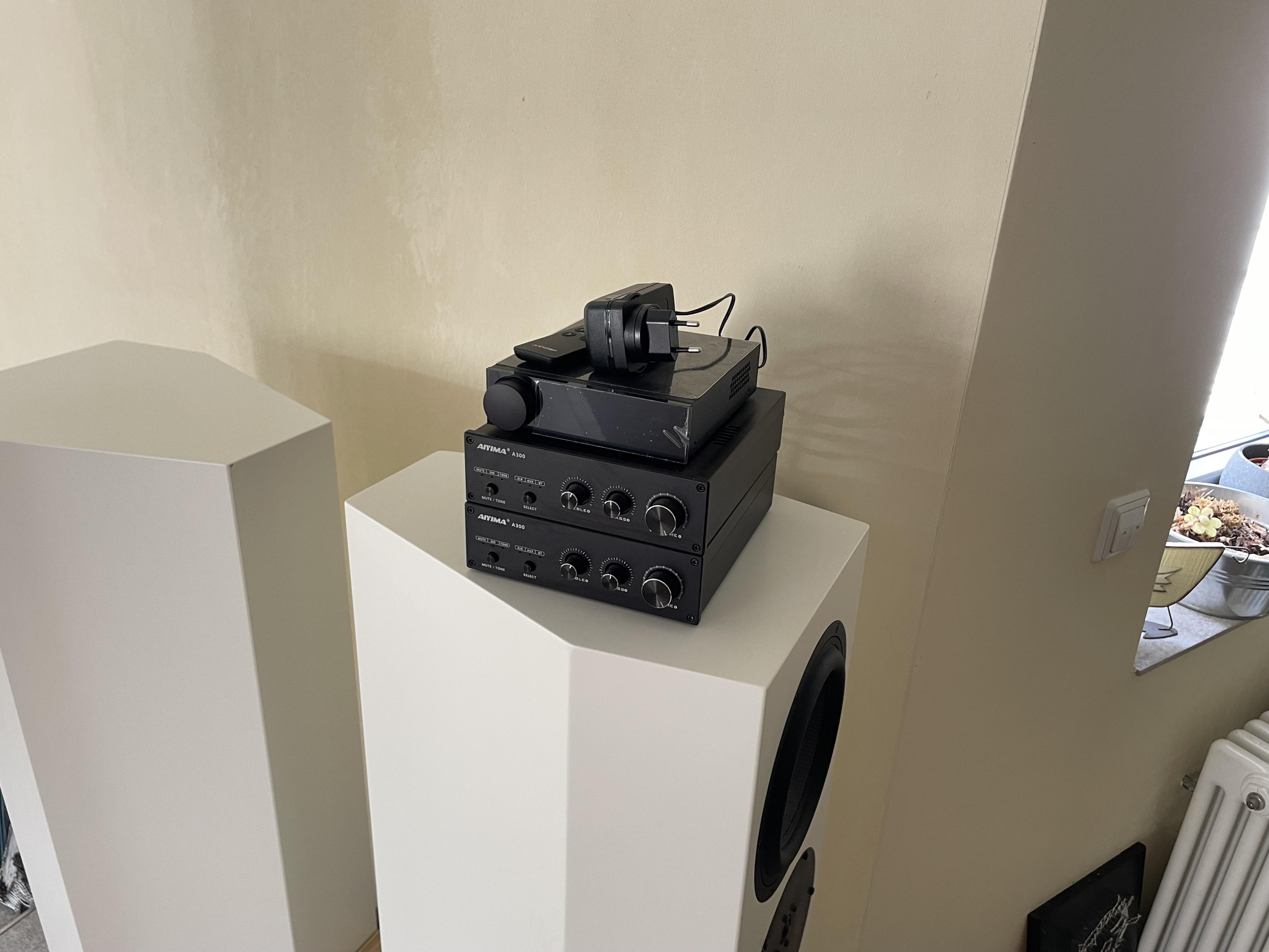 PC an Fosi Dac Symetrisch an The T-Rack DSP und dort per XLR in die Verstärker, dort weiter an die Boxen