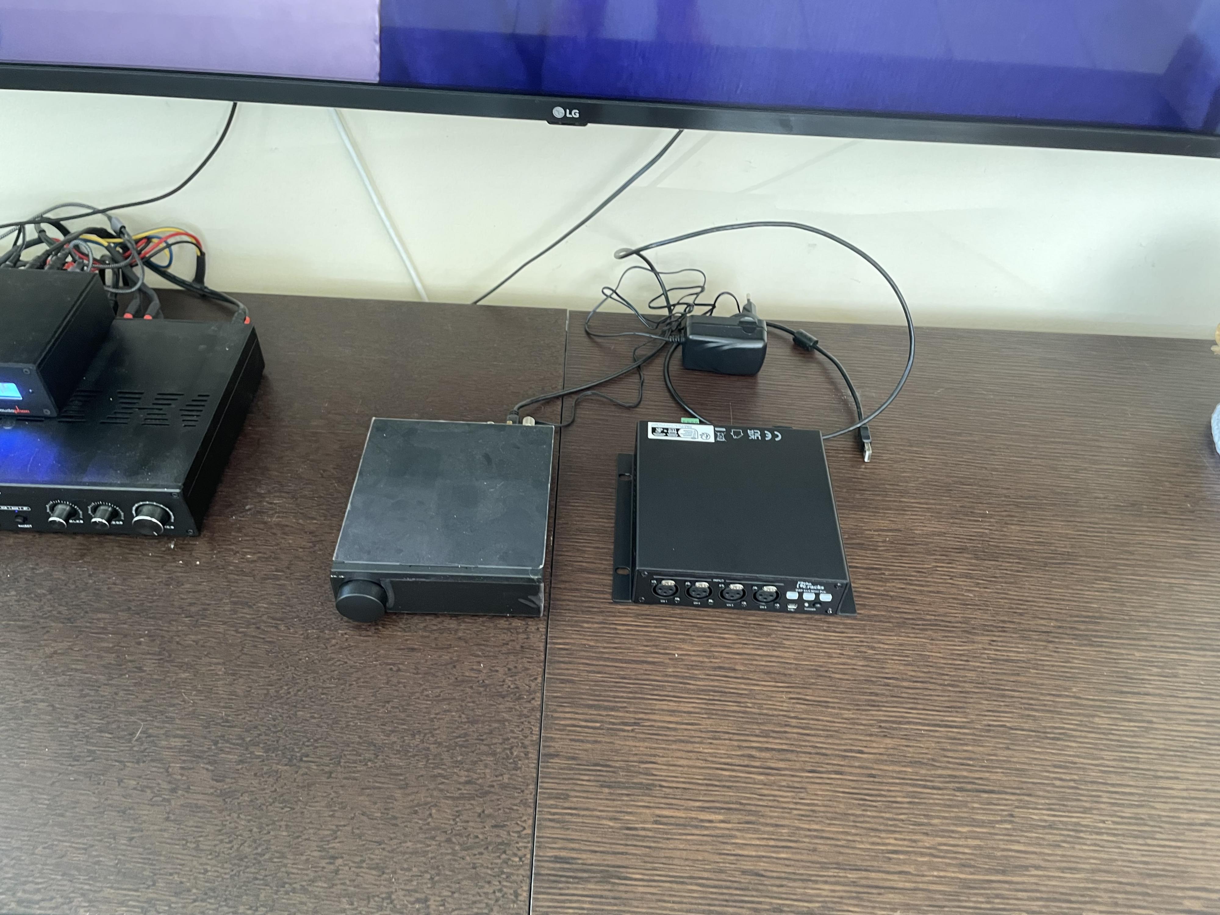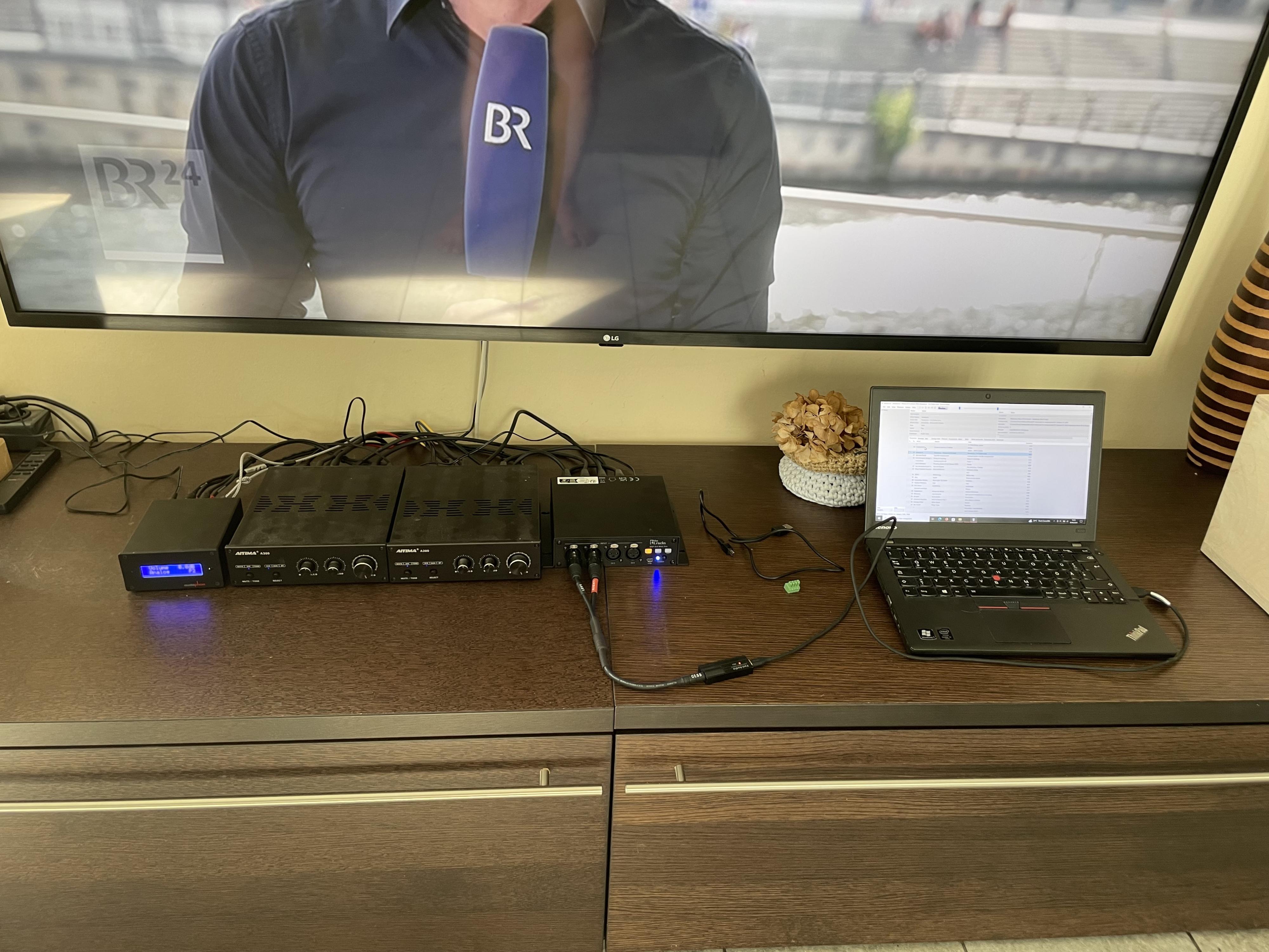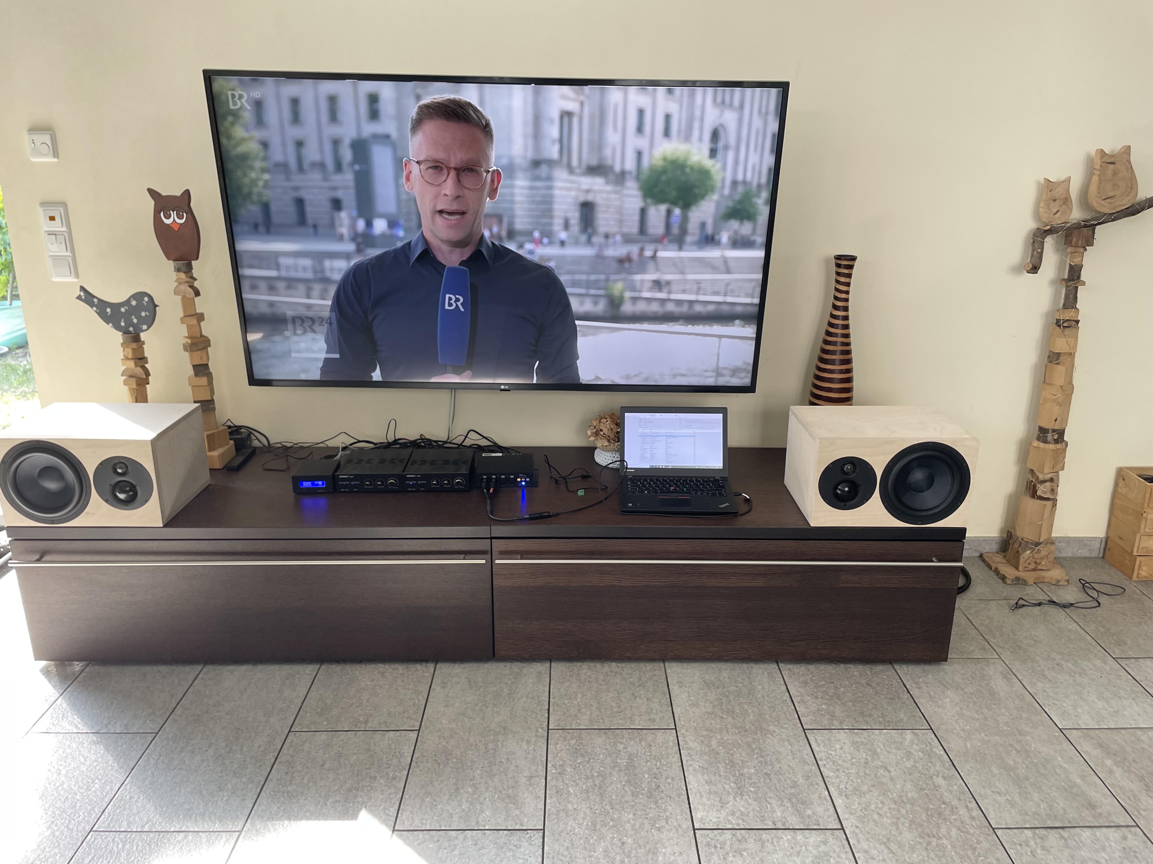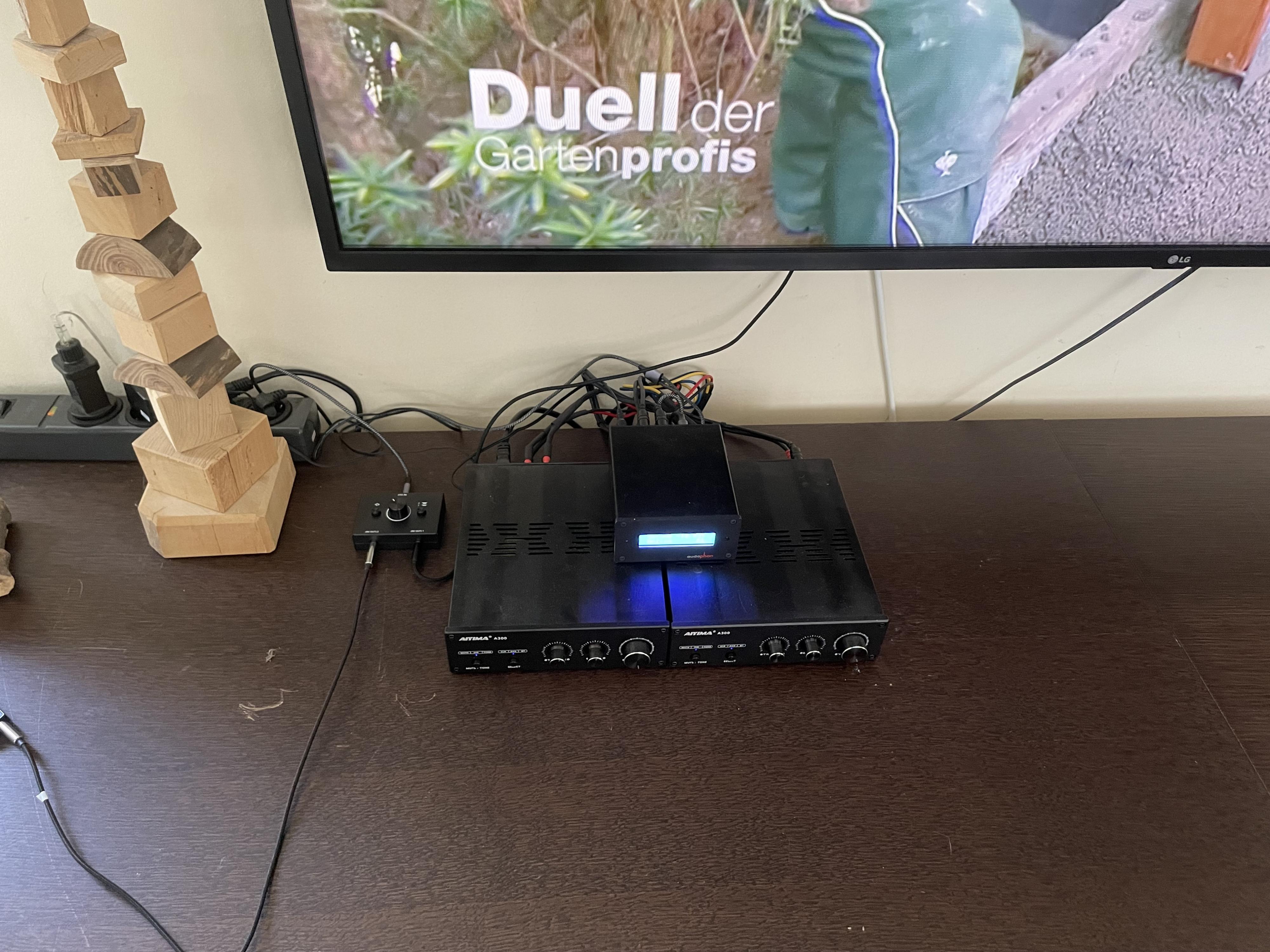 TV mit Klinke und Cinch am Audaphon DSP und per Cinch in die Verstärker, dort weiter an die Boxen